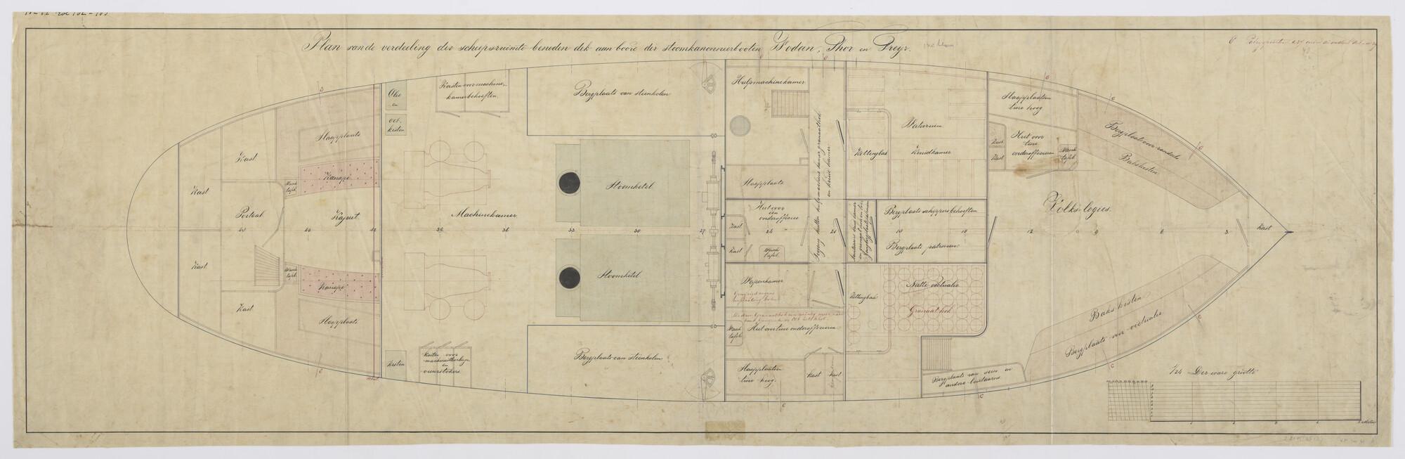 Indelingstekening van het tussendek van de stoomkanonneerboten Zr.Ms. "Wodan", Zr.Ms. "Thor" en Zr.Ms. "Freyr" (schaal 1:24).