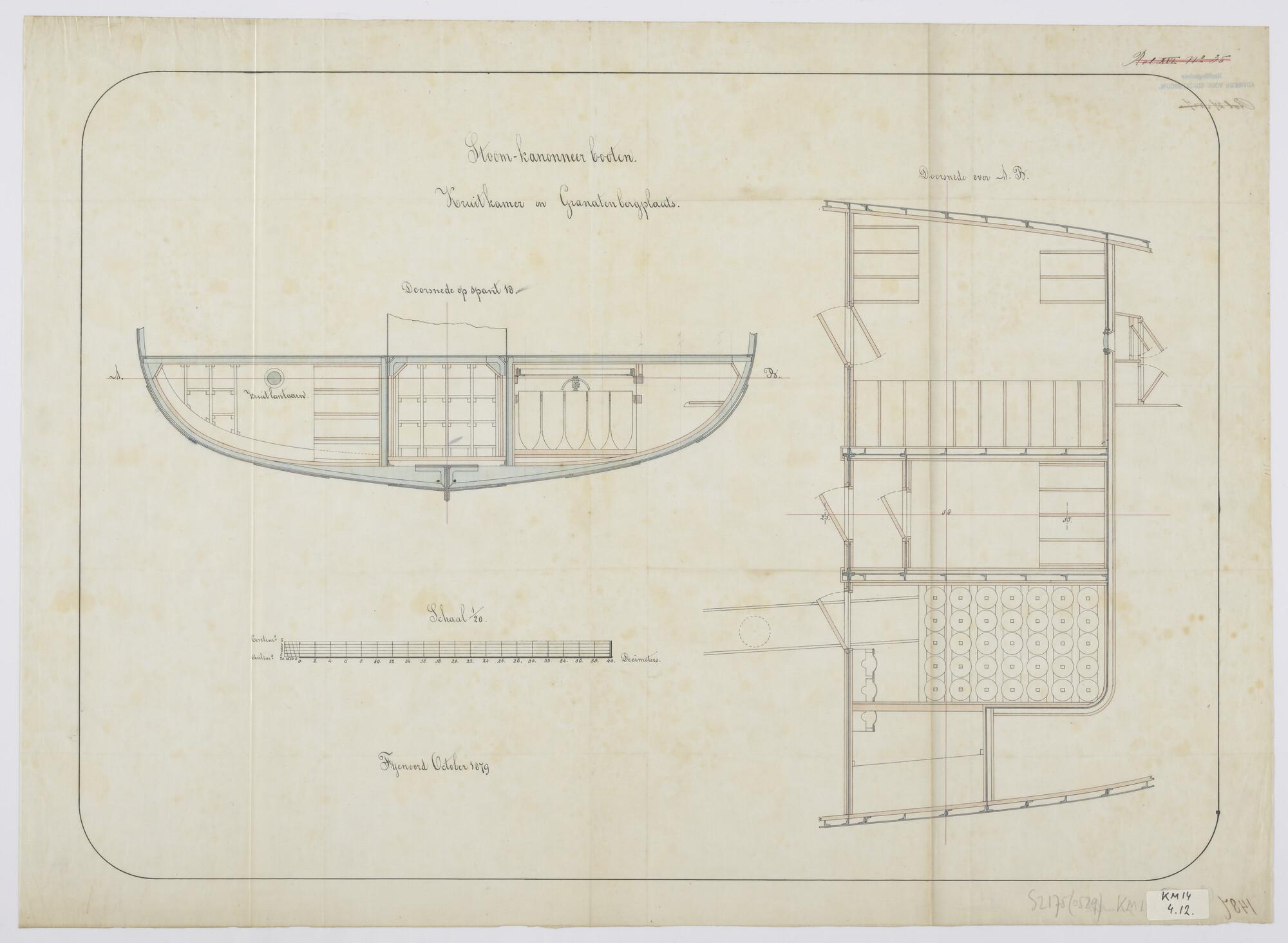 Kruitkamer en granaatbergplaats op het tussendek van de stoomkanonneerboten der eerste klasse type "Wodan" (schaal 1:20).