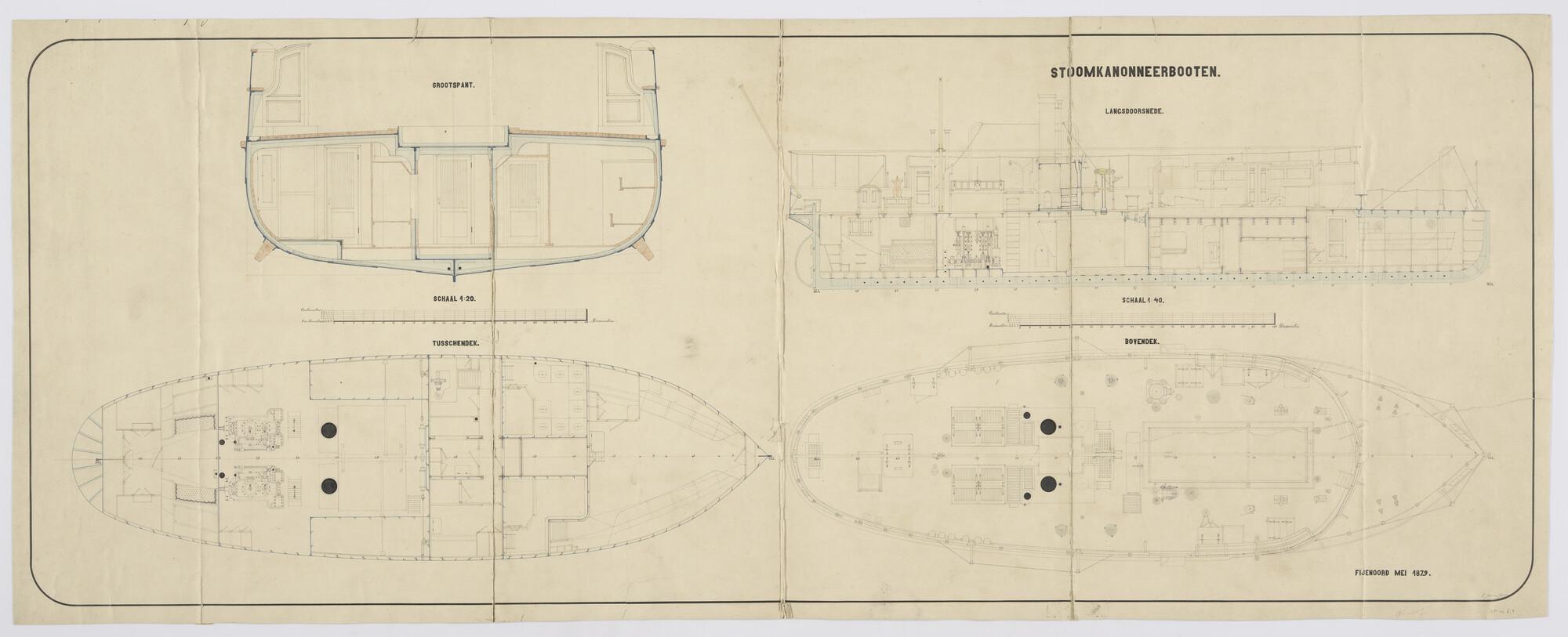 Langsdoorsnede, grootspant, bovendek en tussendek van de stoomkanonneerboten type Wodan