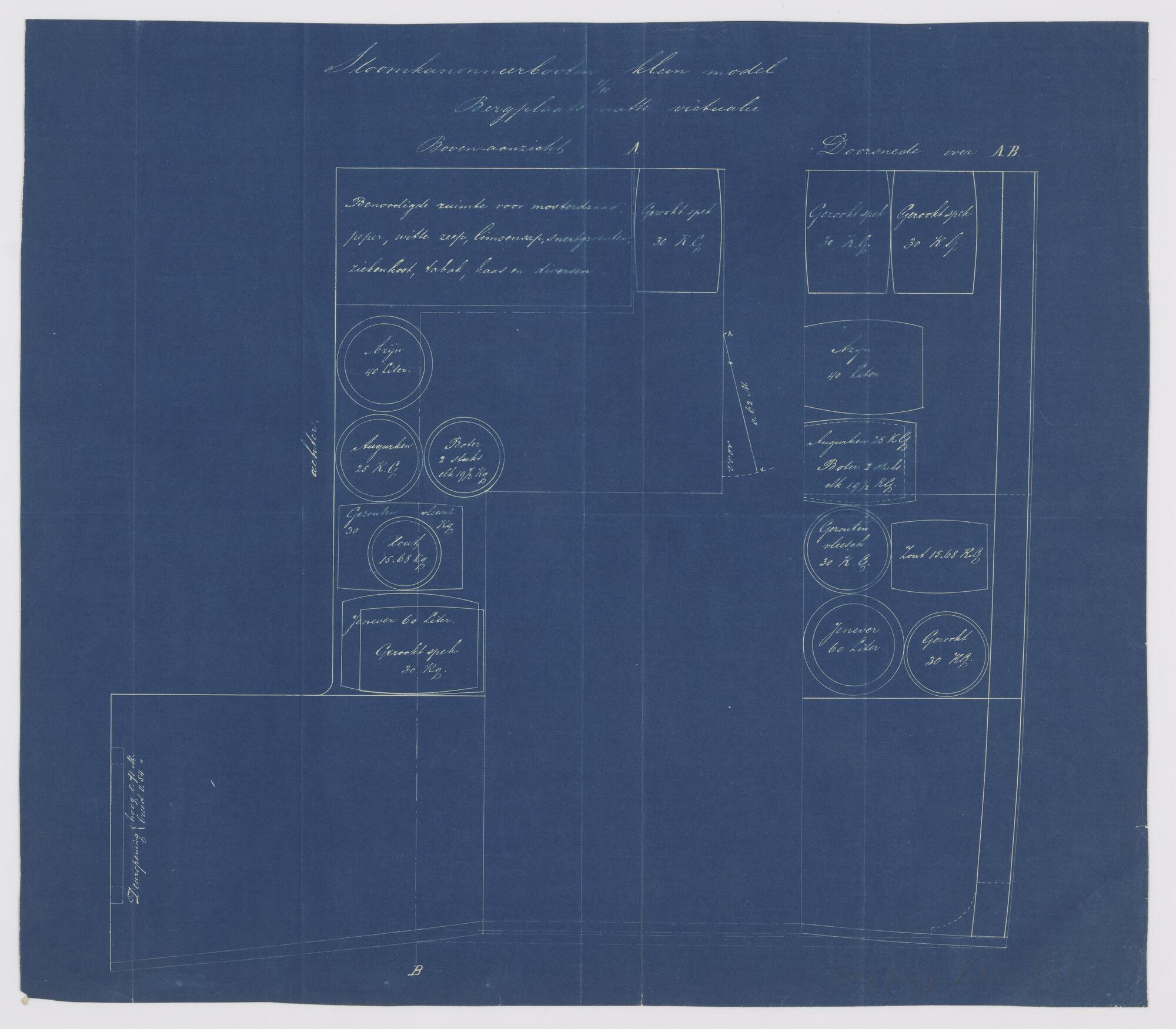 Bovenaanzicht en doorsnede van de bergplaats natte victualie van de stoomkanonneerboten type Wodan