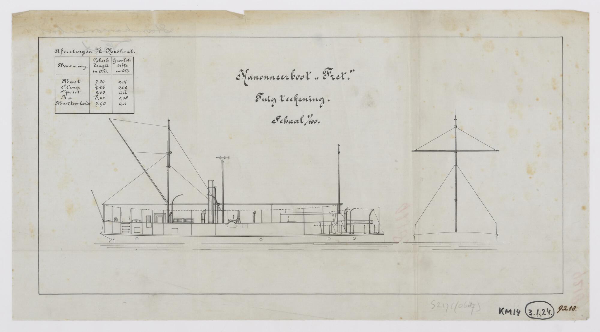 Zij-aanzicht over stuurboord van de stoomkanonneerboot Zr.Ms. Fret als tuigtekening (schaal 1:100).
