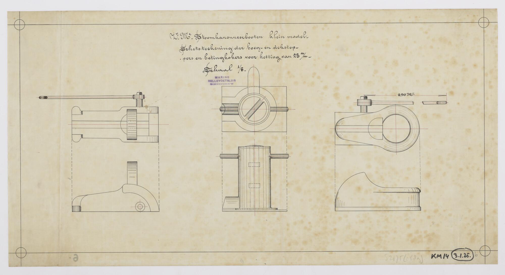 Schetstekening van de boevy- en dekstoppers en betingkoker van de stoomkanonneerboten der eerste klasse type Wodan en die der tweede klasse type Ever (schaal 1:5).