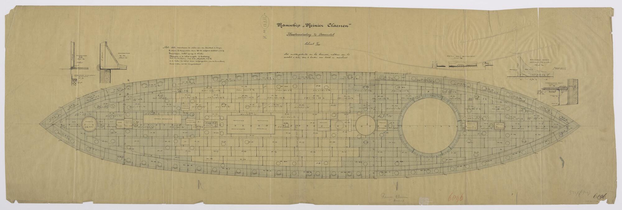 Plaatverdeling van het bovendek van het ramschip Hr.Ms. "Reinier Claeszen" (schaal 1:50).