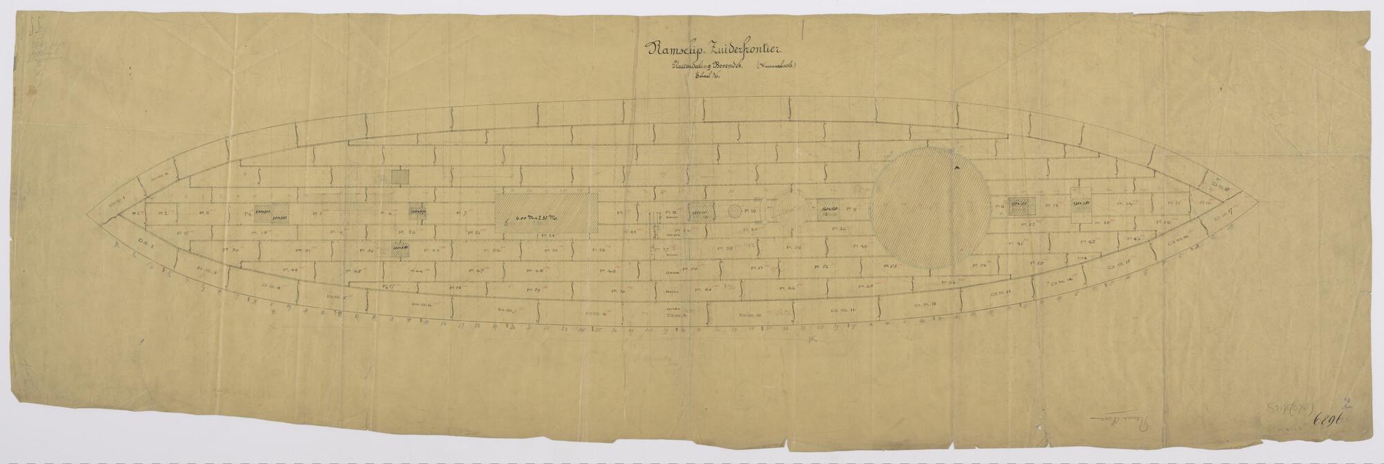 Plaatverdeling van het bovendek (waarnaar bestek) van het ramschip Hr.Ms. Reinier Claeszen (schaal 1:50).
