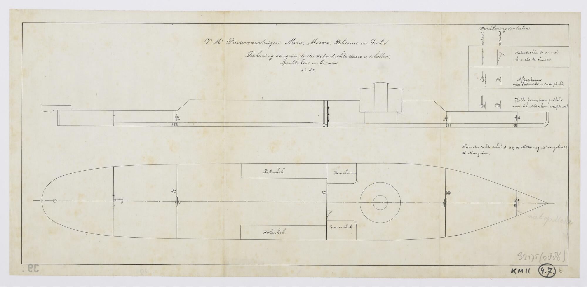 Waterdichte indeling van de gepantserde riviervaartuigen Zr.Ms. Mosa, Zr.Ms. Merva, Zr.Ms. Rhenus en Zr.Ms. Isala (schaal 1:80).