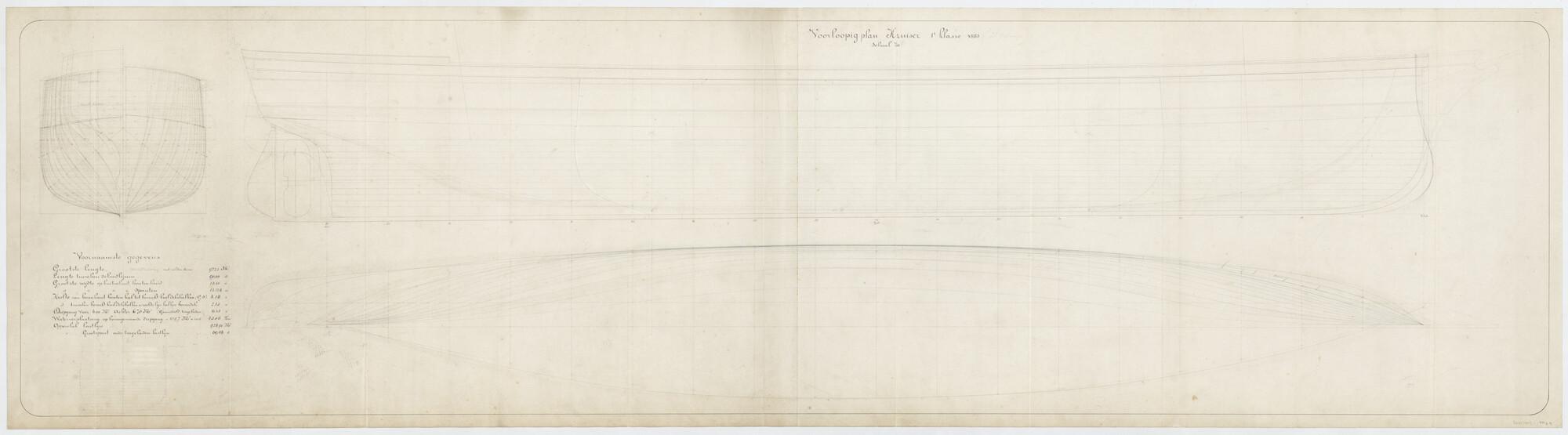 'Ontwerp kruiser 1ste klasse', 1883 - 1884. 4306 ton. Voorlopig plan. Afmetingen 97.25 x 13.50 x 8.18 meter. Zijaanzicht, spantenraam, verticalen, senten, waterlijnen, met en zonder ramsteven (schaal 1:50).