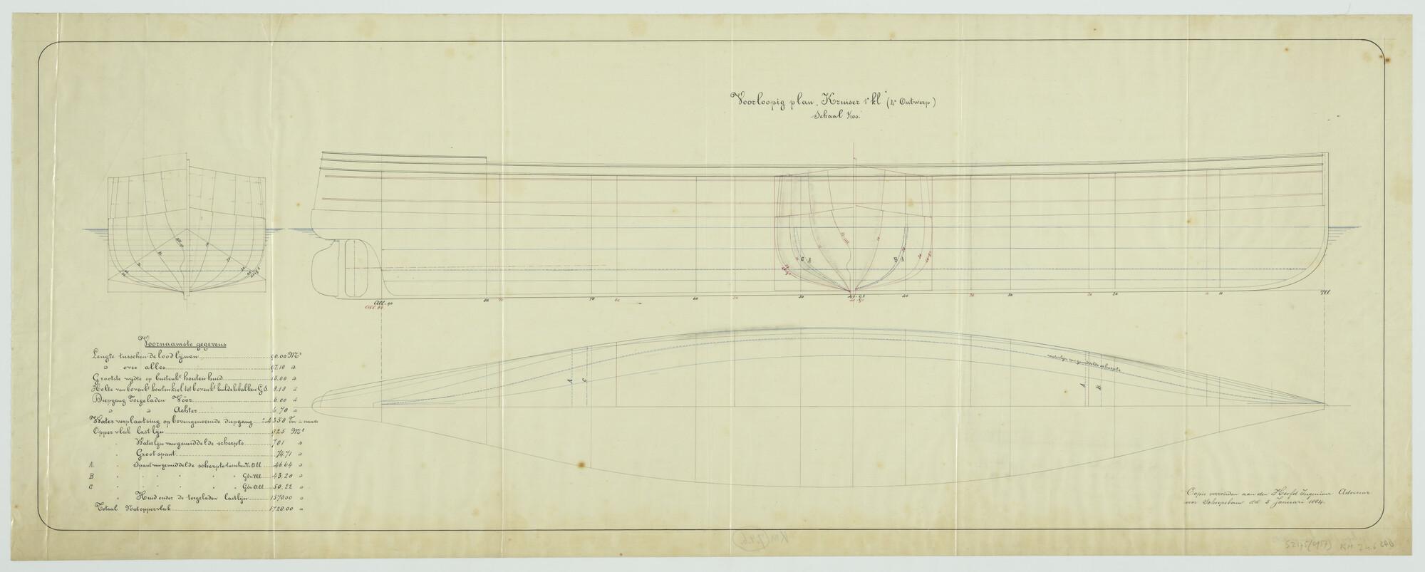 'Ontwerp kruiser 1ste klasse', 1883 - 1884. 4e ontwerp 1884. 4350 ton 97.10 x 15 x 8.18 meter. Enkelschroef zonder rameter, zijaanzicht, waterlijnen (schaal 1:100).