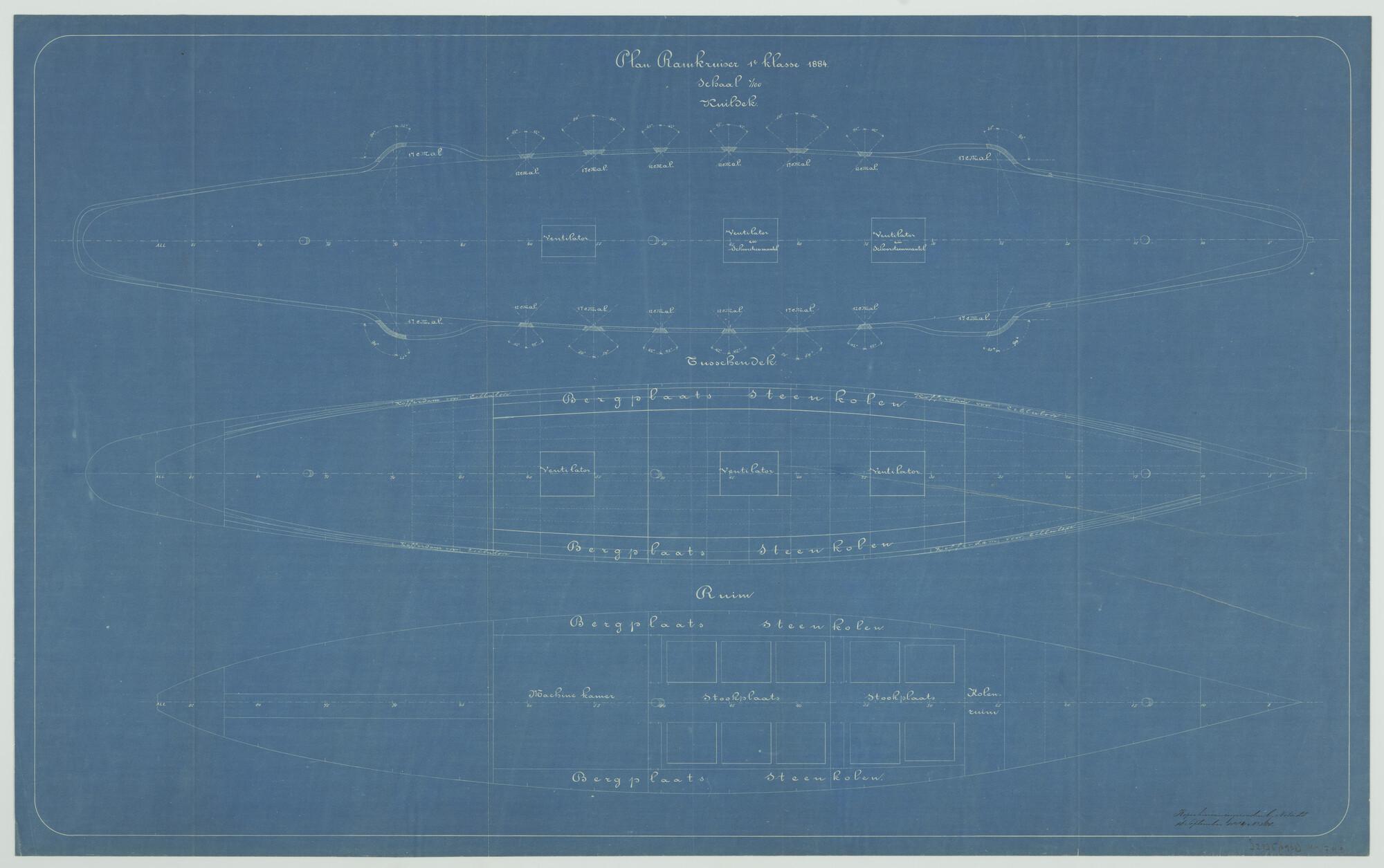 'Ontwerp kruiser 1ste klasse', 1883 - 1884. 4006 ton. 95.9 x 14.6 x 8.16. Zijaanzicht, spantenraam, waterlijnen, verticalen, (10 dwars scheeps geplaatste schotse ketels, 2 schoorstenen). Kuildek, tussendek en ruim (schaal 1:100).