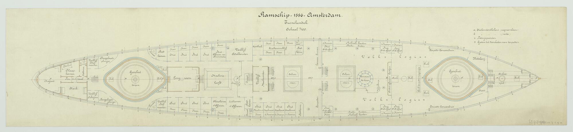 'Ontwerp ramschip "Amsterdam", 1886'. Tussendek. Ankerinrichting, geschuttorens, torpedolanceerbuizen, accommodatie, commandotoren, schoorstenen, machinehoofd. Originele tekening met transparant afdruk (schaal 1:100).