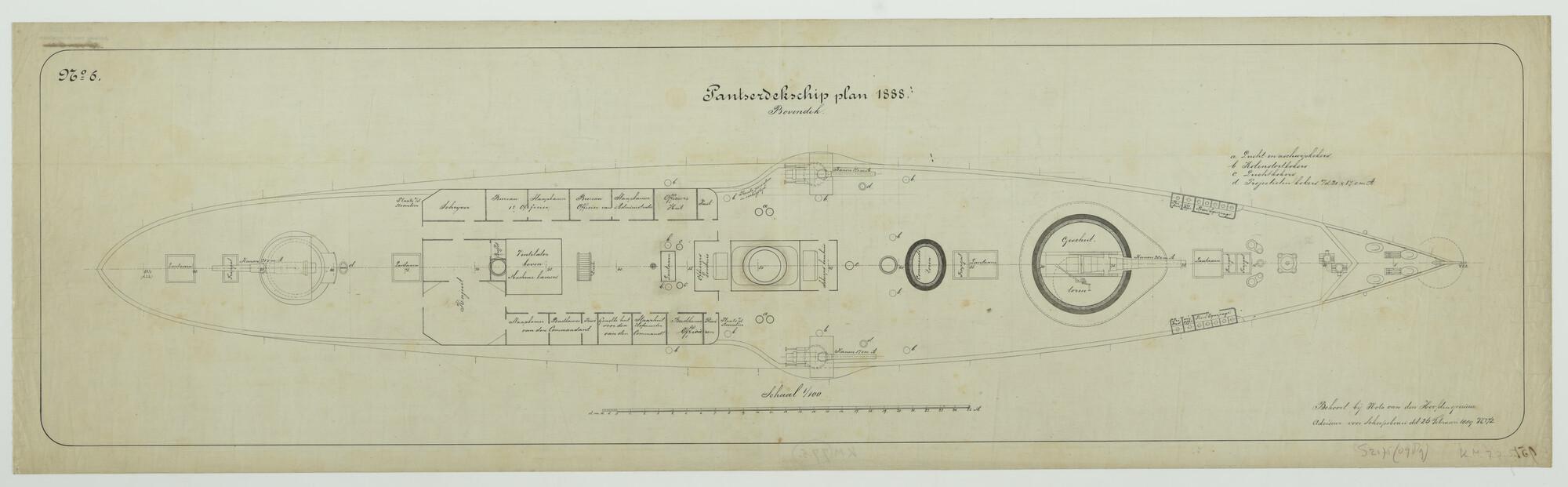 'Pantserdekschip plan 1888'. Bovendek (schaal 1:100).