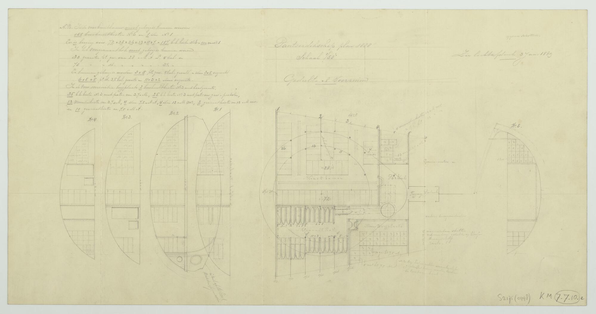 'Pantserdekschip plan 1888'. Munitiebergplaatsen (kruitkamers en granaathokken) in het voorruim. Originele tekening (schaal 1:50).