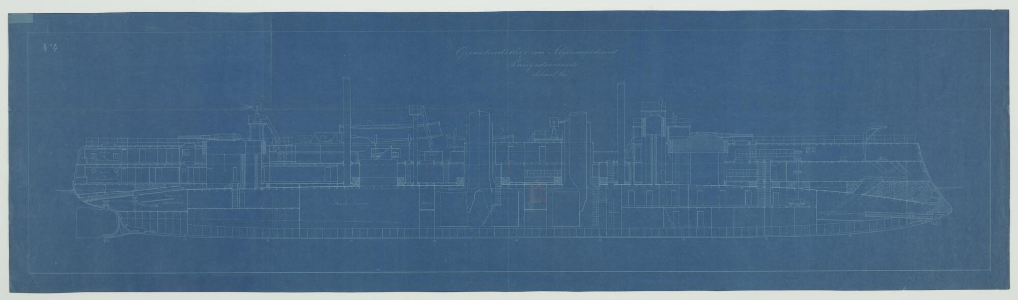 'Gepantserd schip voor algemene dienst 1890'. Verticale langsdoorsnede. Kanons 21 cm in open barbettes (schaal 1:100).