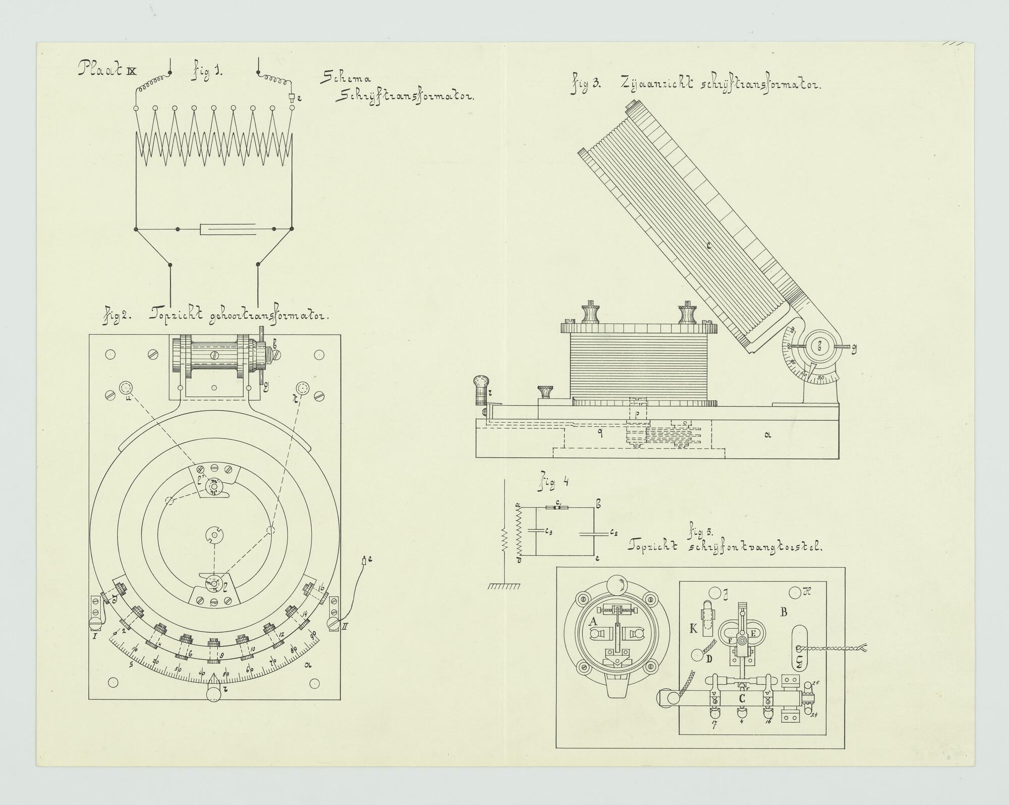 Elektrische schema's van het gehoorontvangtoestel en het schrijfontvangtoestel van het pantserdektorenschip Hr.Ms. "Koningin Wilhelmina der Nederlanden". Originele tekening.