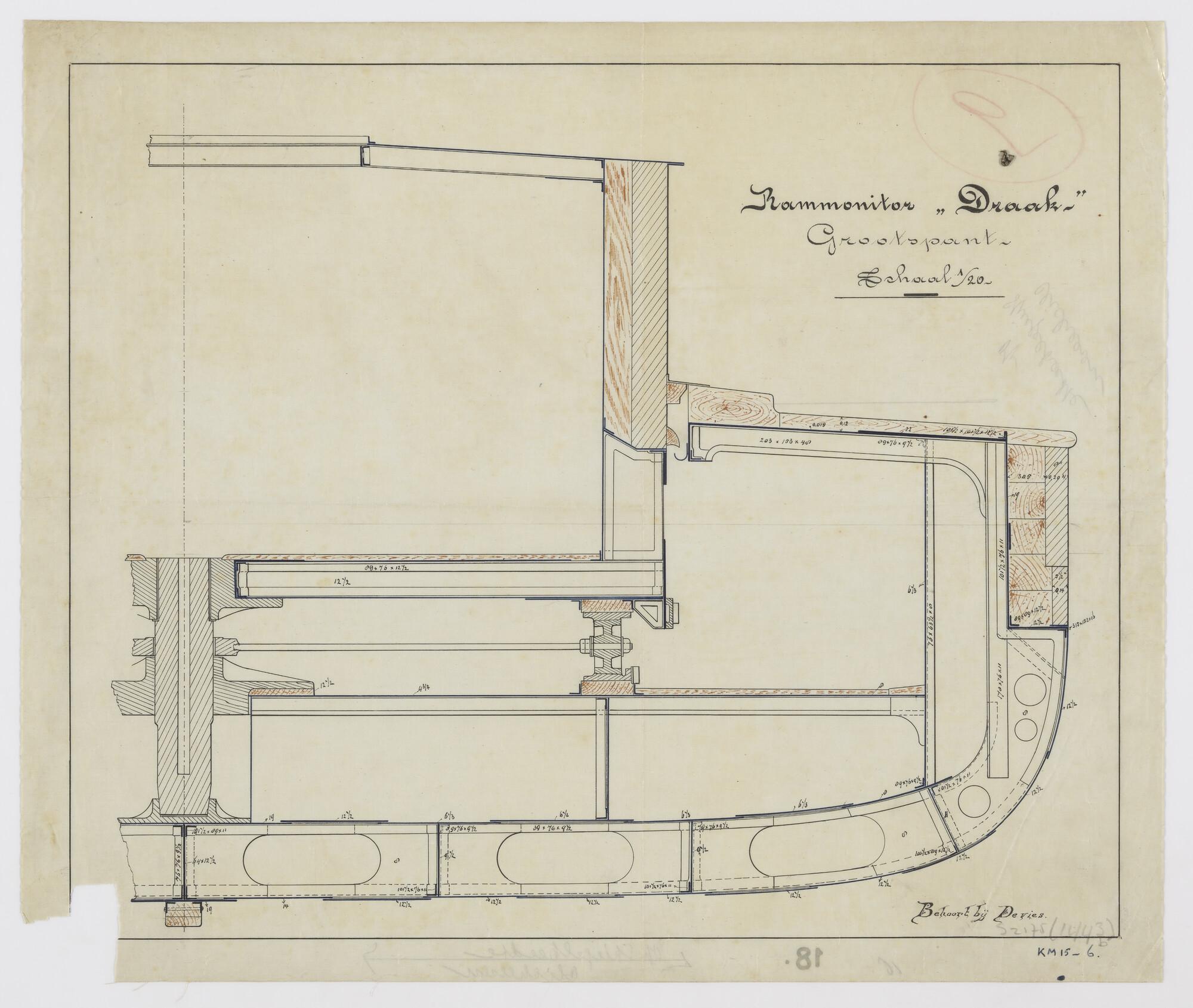 Grootspant ter hoogte van de geschuttoren van de rammonitor 1ste klasse Zr.Ms. "Draak". Pantsergordel met aan de binnenzijde houten balken, hout belegd dek, pantsergordel om de geschuttoren, beweging van de toren en draaispil met fundatie op de dubbele bodem (schaal 1:20).