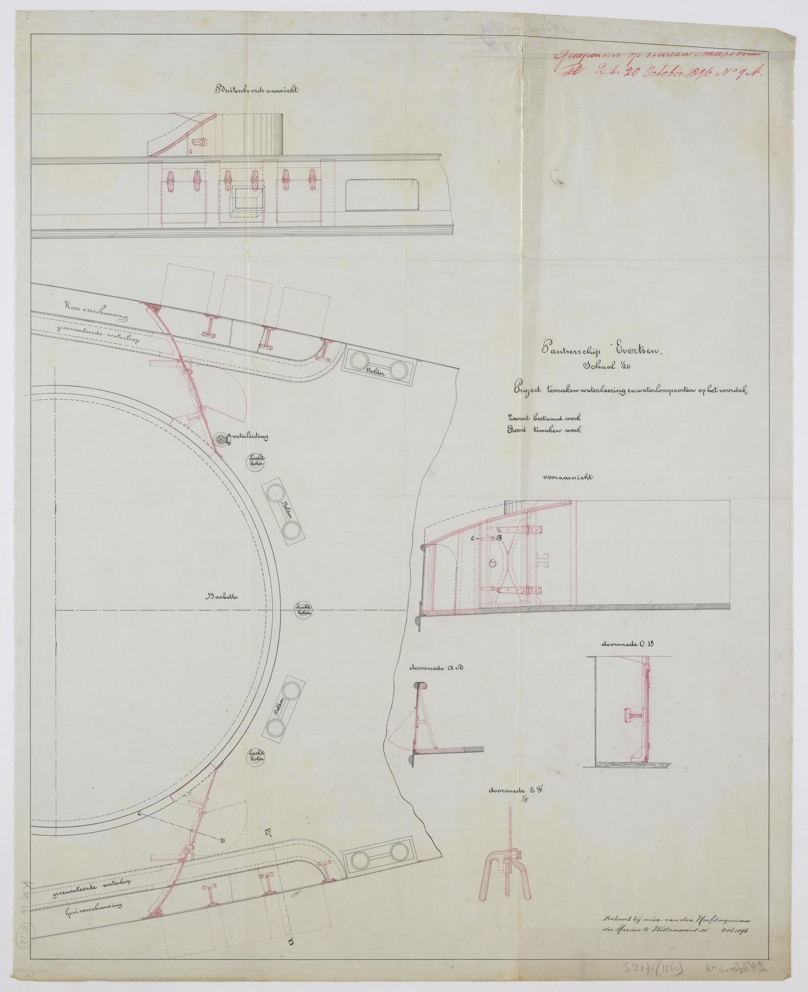 Bovenaanzicht en diverse doorsneden van de waterkering en waterloospoorten op het voordek bij de barbette van het pantserschip Hr.Ms. "Evertsen". De waterkering tussen de barbette en de kooiverschansing, de loospoorten (drie stuks) in die verschansing (schaal 1:20).