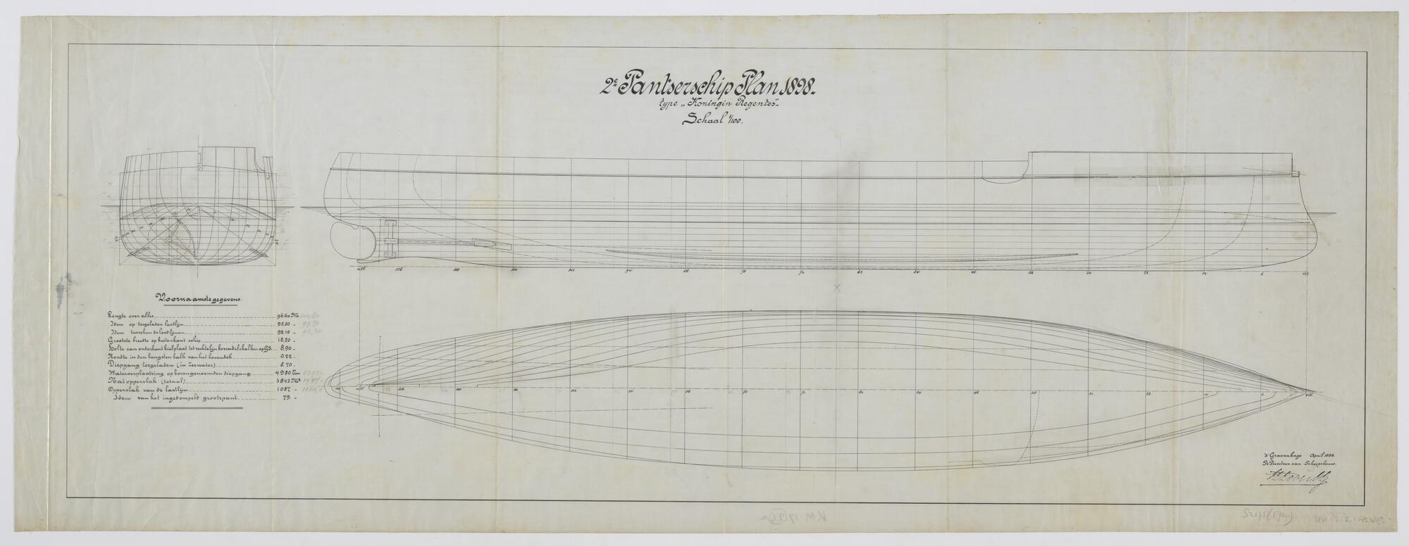 Lijnenplan en spantenraam van het 2de pantserschip plan 1898 type 'Koningin Regentes'