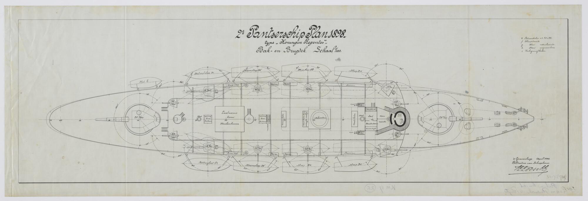 Bovenaanzicht van de bak en het brugdek van het 2de pantserschip plan 1898 type "Koningin Regentes". Half open stuurhuis, ankerinrichting, kanon van 24 cm op de bak, sloepen, lantaarns, toegangen, schoorsteen, ventilatoren (schaal 1:100).