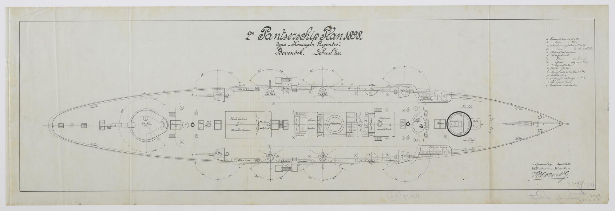 Bovenaanzicht van het bovendek van het tweede pantserschip plan 1898 type Koningin Regentes