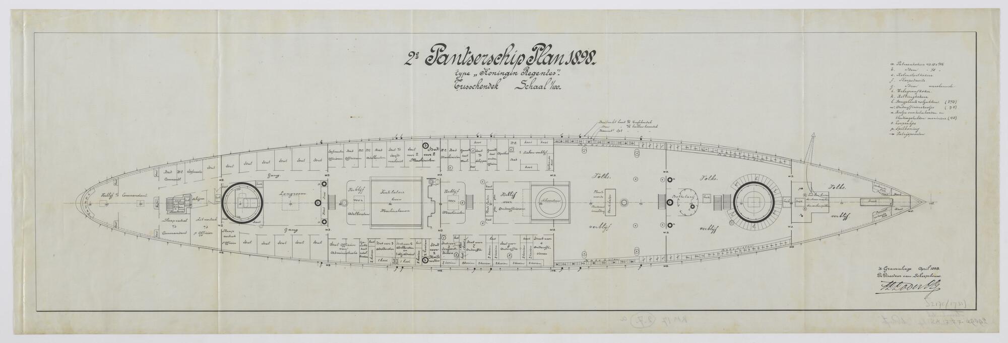 Bovenaanzicht van het tussendek van het tweede pantserschip plan 1898 type Koningin Regentes