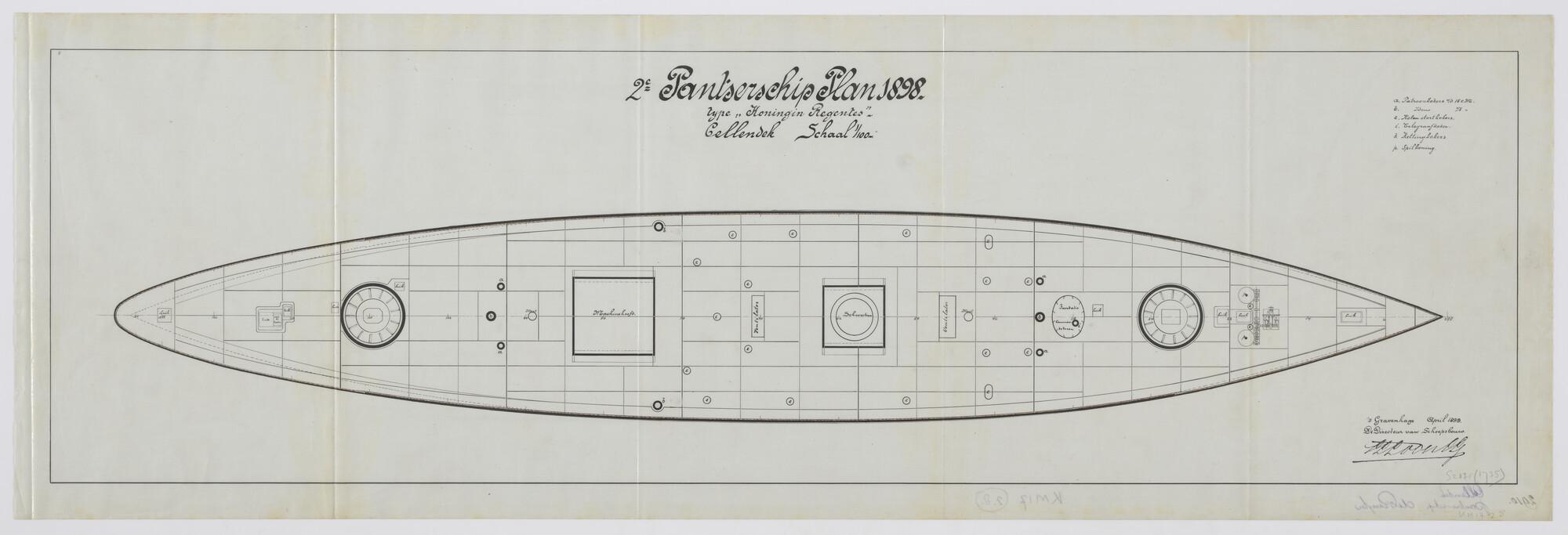 Bovenaanzicht van het cellendek van het 2de pantserschip plan 1898 type "Koningin Regentes". Pantsergordel op de waterlijn, gepantserde schachten van de kanons voor-en-achter, machinehoofd, schoorsteendoorvoering, fundatie commandotoren, luiken, ventilatoren (schaal 1:100).
