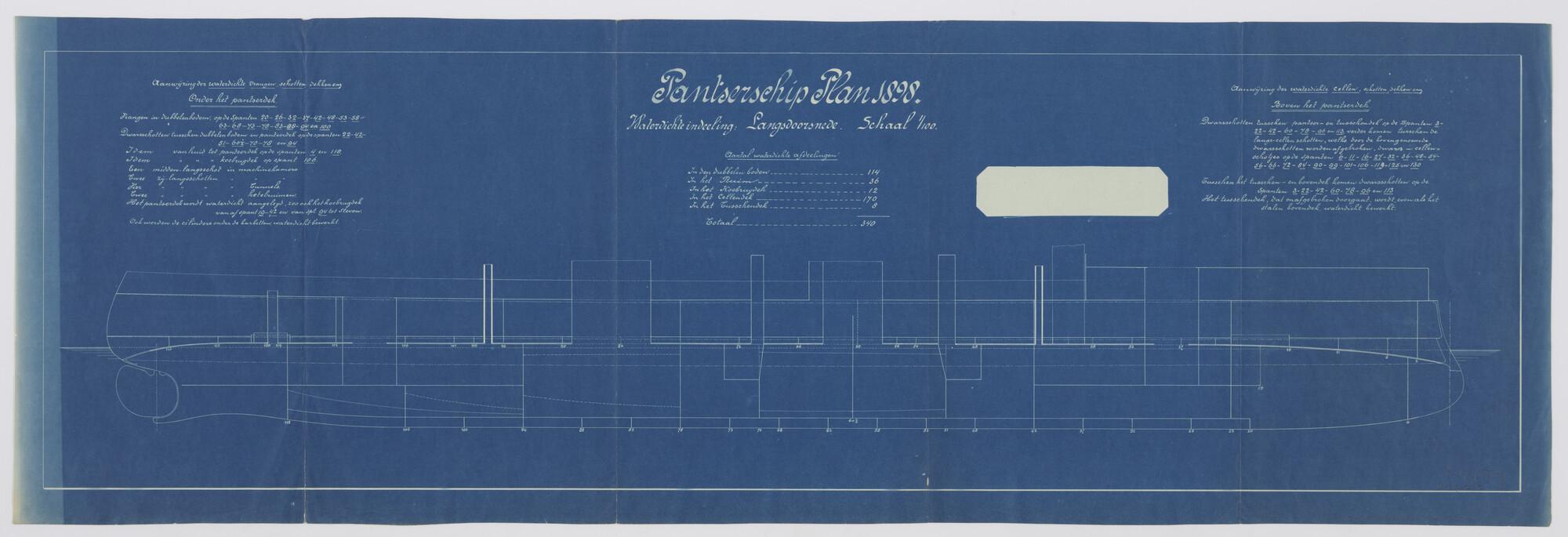 Langsdoorsnede met waterdichte indeling van het 2de pantserschip plan 1898 type "Koningin Regentes". Waterdichte wrangen, schotten en dekken onder het pantserdek. Waterdichte cellen, schotten en dekken boven het pantserdek. Aantal waterdichte afdelingen (totaal 340) (schaal 1:100).