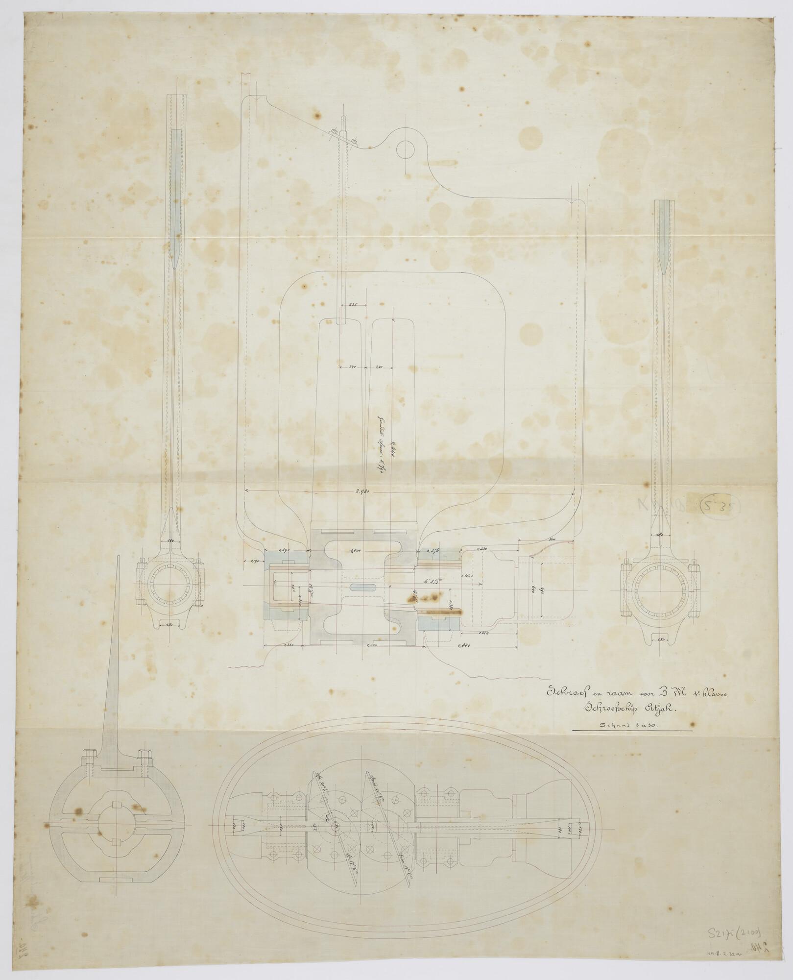 Schroef en raam voor Zr.Ms. 1e klasse schroefschip "Atjeh". Diverse doorsneden van schroef en schroefraam met dubbele schroefbladen van het schroefstoomschip der eerste klasse Zr.Ms. "Atjeh" (schaal 1:10).