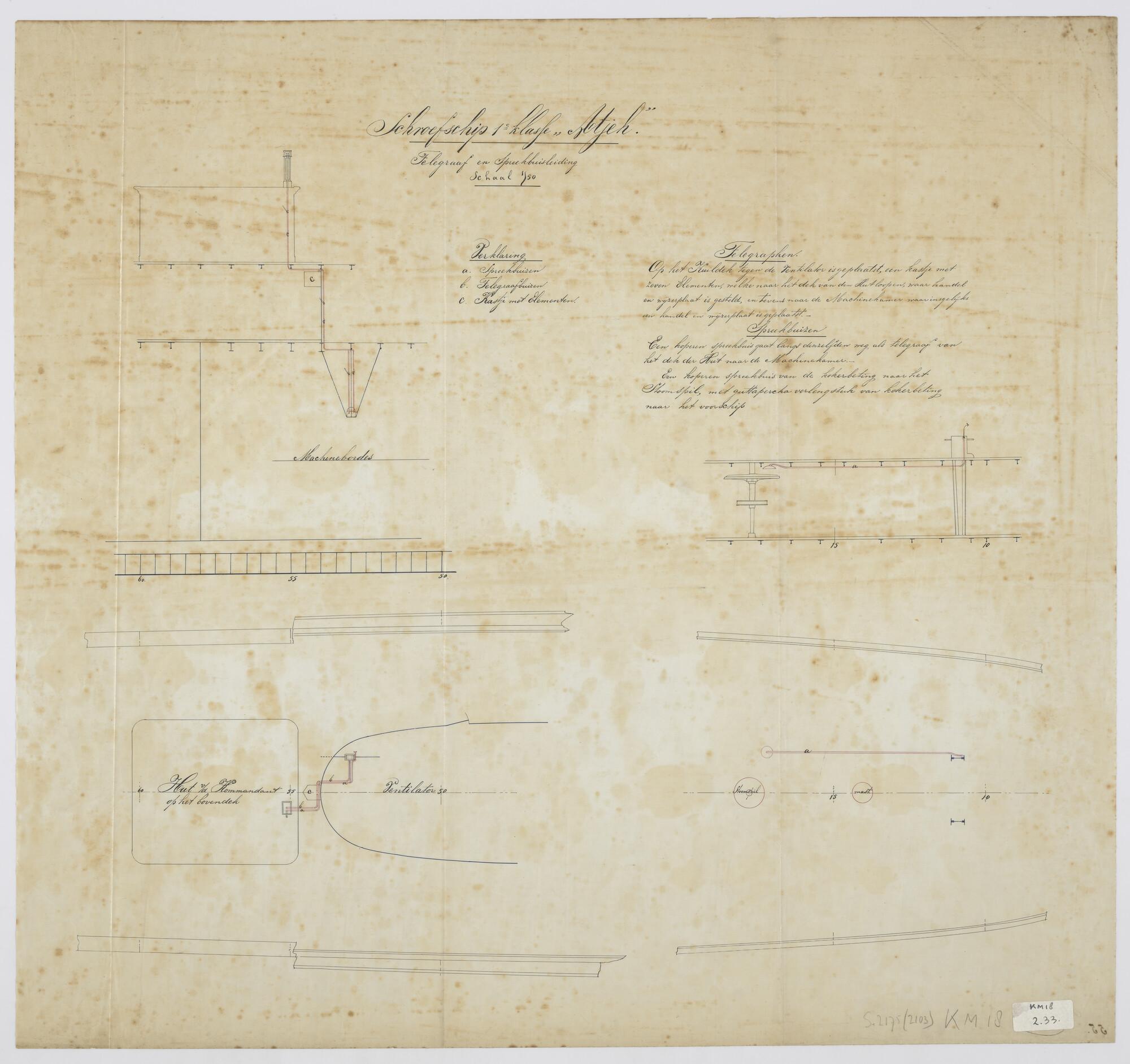 Telegraafbuizen, spreekbuizen, kastje met elementen van het schroefstoomschip der eerste klasse Zr.Ms. "Atjeh". Telegraaf- en spreekbuizen tussen hut commandant op het bovendek naar machinekamer (schaal 1:50).