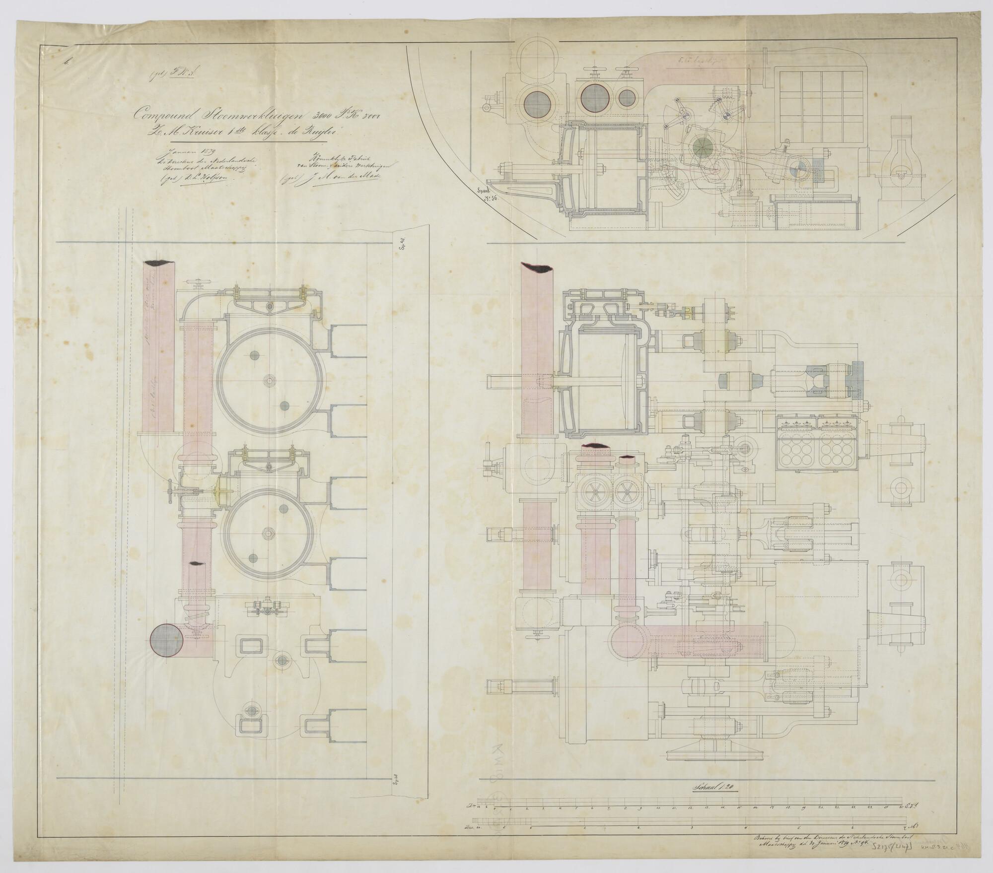 Horizontale en verticale dwarsdoorsnede over spant 56 alsmede het zijaanzicht van de drie cilinder compound hoofdstoommachine van het schroefstoomschip der eerste klasse Zr.Ms. De Ruyter (1879) (schaal 1:20).