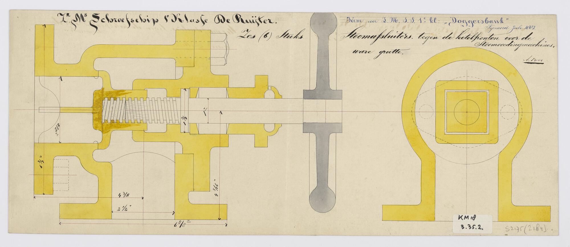 Twee doorsneden van stoomafsluiters tegen de ketelfronten voor de stoommachines van de schroefstoomschepen der eerste klasse Zr.Ms. "De Ruyter" (1879) en Zr.Ms. "Doggersbank". Originele tekening (schaal in ware grootte).