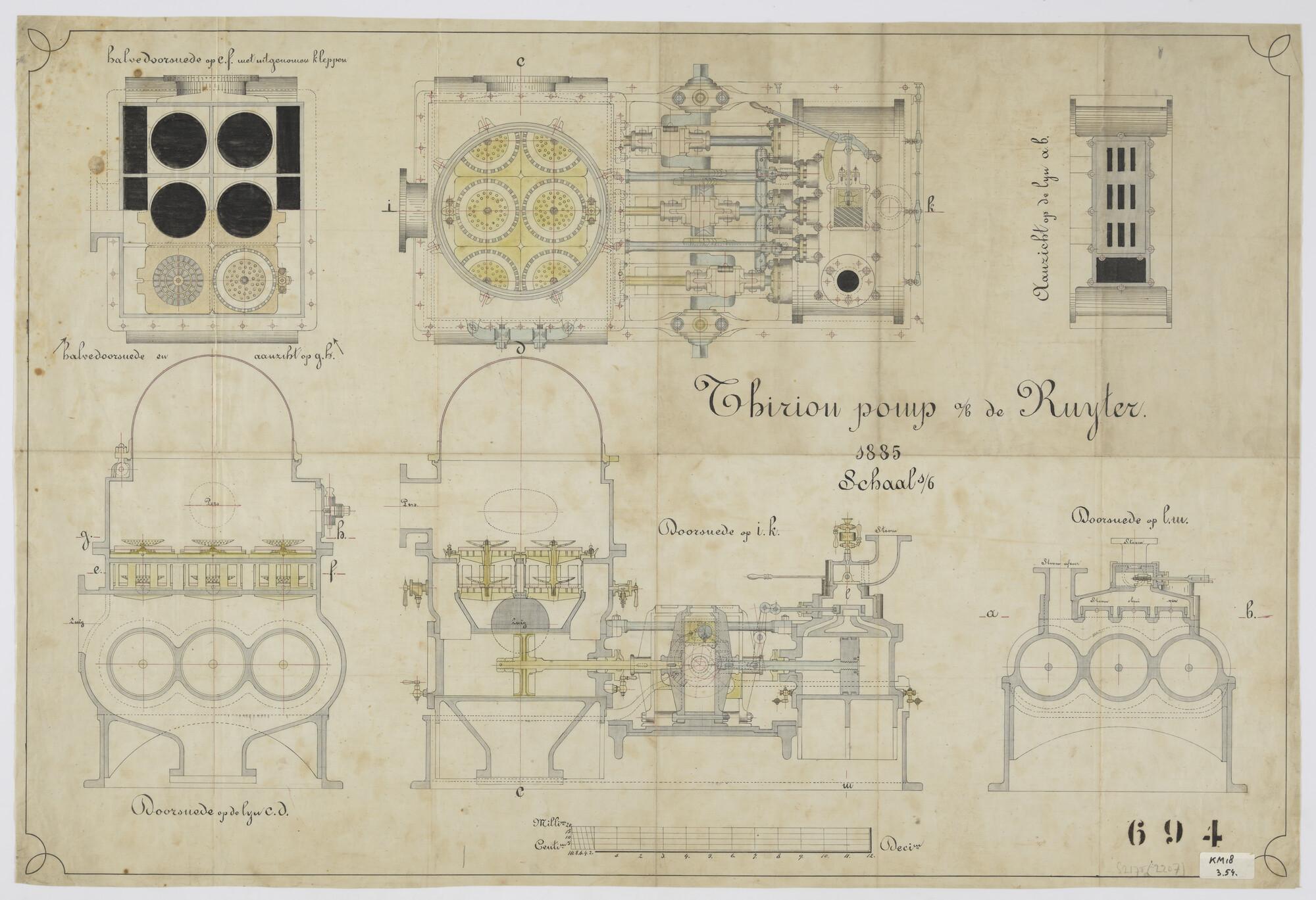 Thiriou pomp a/b "De Ruyter", 1885. Diverse doorsneden van de Thiriou pomp van het schroefstoomschip der eerste klasse Zr.Ms. "De Ruyter" (1879) (schaal 1:6).