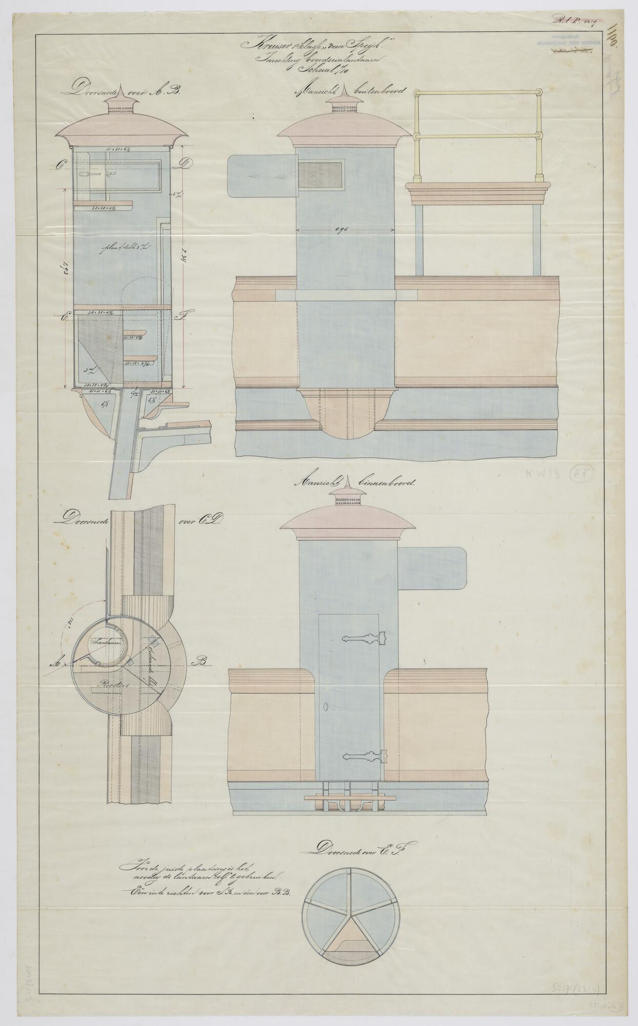 Binnen- en buitenboordaanzicht en drie doorsneden van een boordseinlantaarn van het schroefstoomschip Zr.Ms. Van Speyk