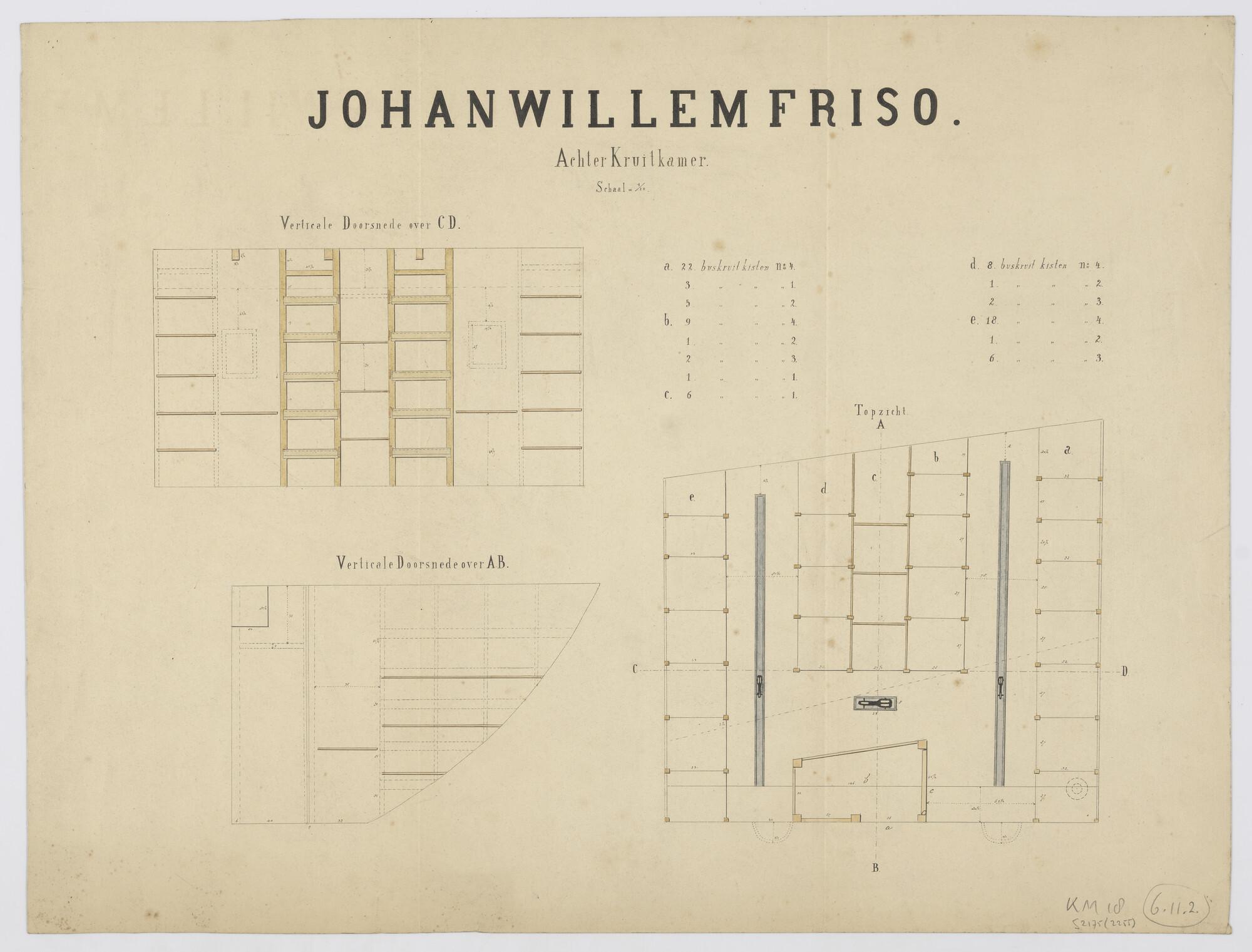 Indelingstekening van de achterkruitkamer van het schroefstoomschip der eerste klasse Zr.Ms. "Johan Willem Friso" (aanv. "Kortenaer"). Overzicht van de hoeveelheden opgeslagen buskruit. Originele tekening (schaal 1:20).