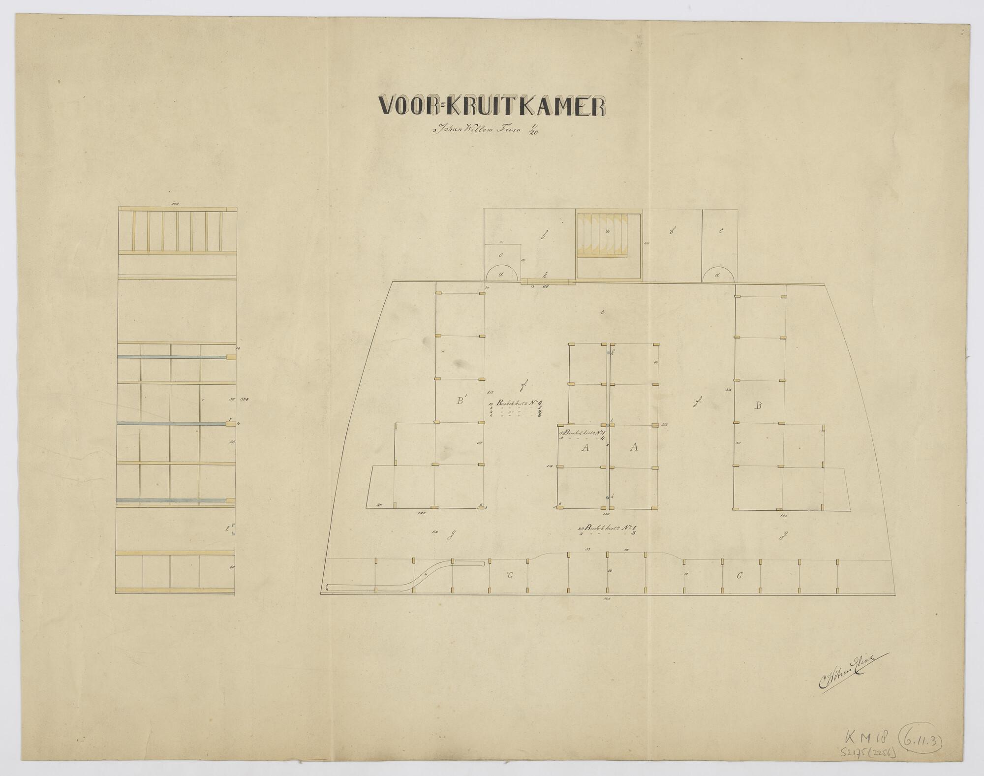 Indelingstekening van de vóórkruitkamer van het schroefstoomschip der eerste klasse Zr.Ms. 'Johan Willem Friso' (aanv. 'Kortenaer')