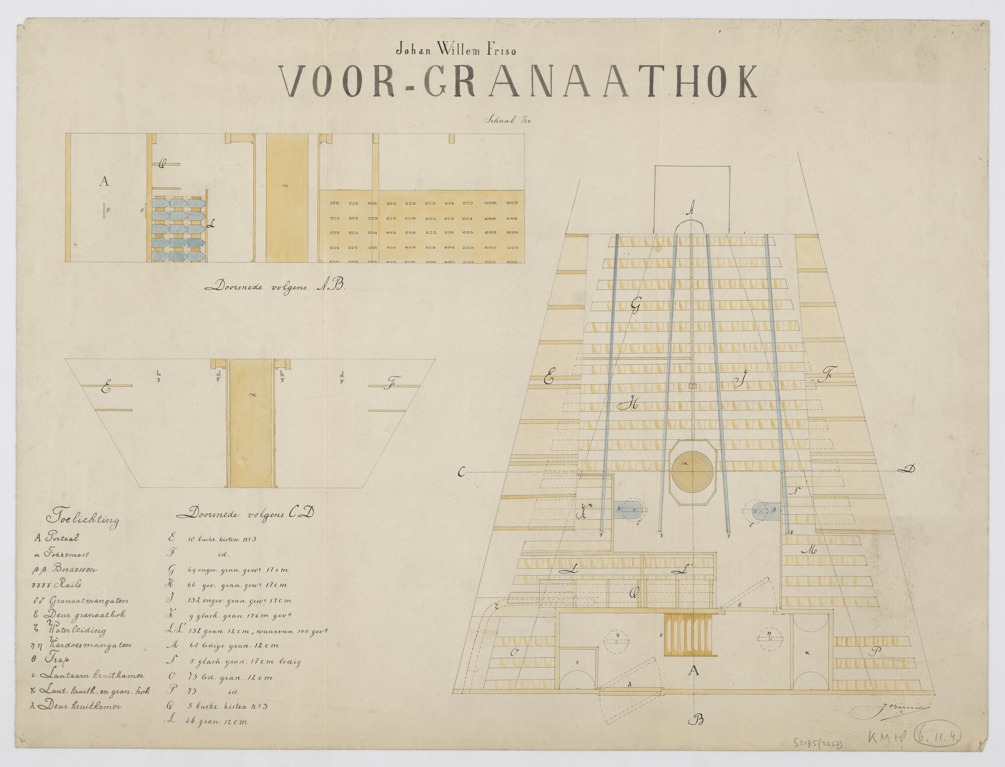 Indelingstekening van het vóórgranaathok van het schroefstoomschip der eerste klasse Zr.Ms. "Johan Willem Friso" (aanv. "Kortenaer"). Overzicht van de hoeveelheden en soorten opgeslagen buskruit, gevulde en lege granaten etc. Twee doorsneden. Originele tekening (schaal 1:20).