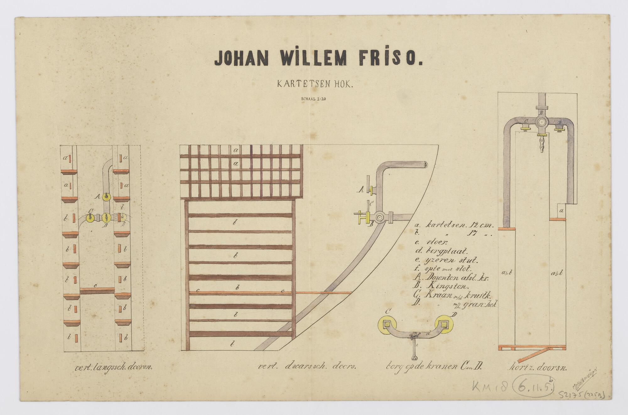 Indelingstekening van het kartetsenhok voor opslag van kartetsen 12 cm en 17cm van het schroefstoomschip der eerste klasse Zr.Ms. "Johan Willem Friso" (aanv. "Kortenaer"). Horizontale en verticale dwarsdoorsneden. Brandblusleiding met kranen. Originele tekening (schaal 1:20).