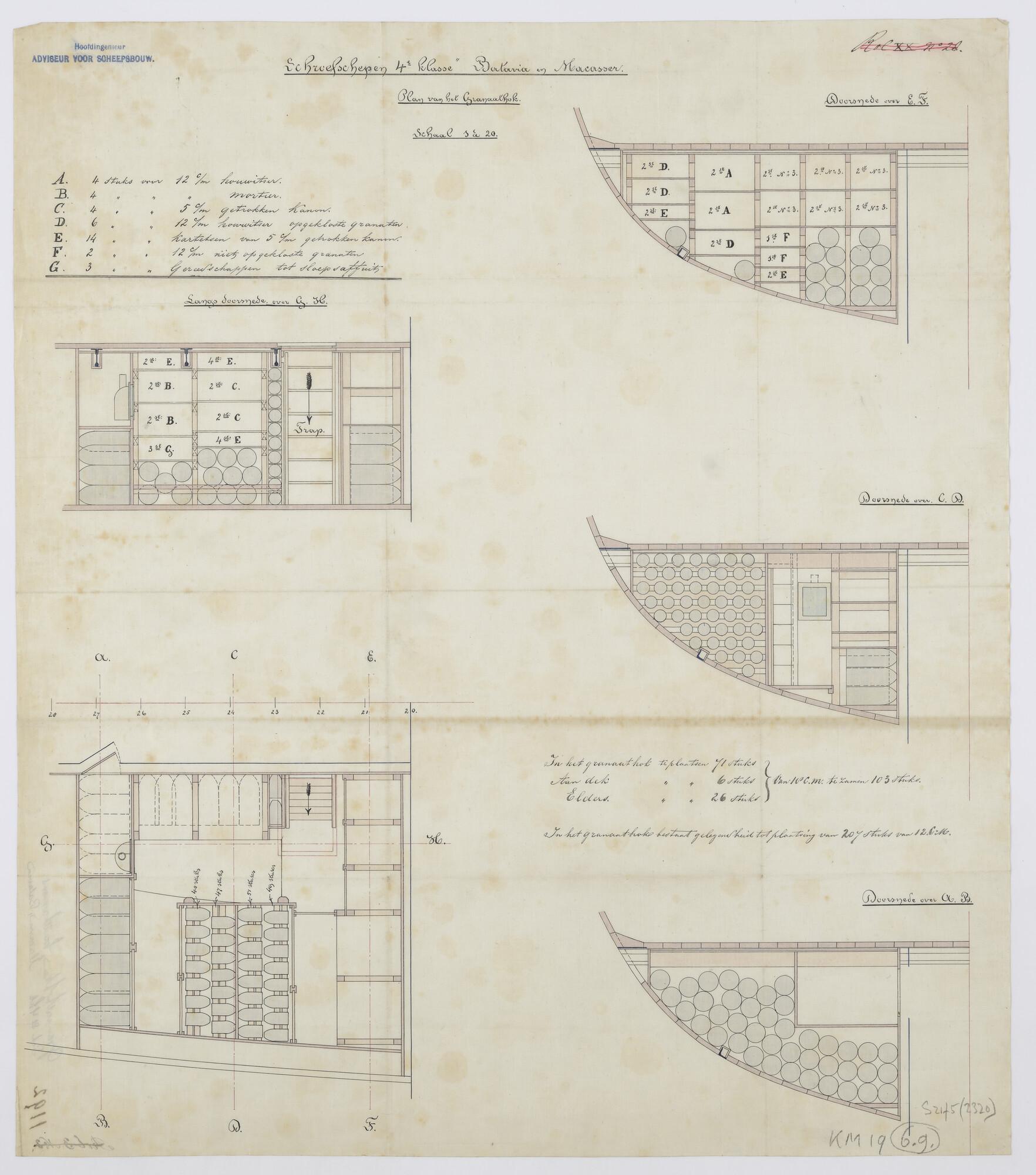 Indelingstekening van het granaathok in het ruim-achteruit van de schroefstoomschepen der vierde klasse Zr.Ms. "Batavia" en Zr.Ms. "Makasser". Opgave van hoeveelheden en soorten granaten. Drie halve dwarsdoorsneden en een langsdoorsnede (schaal 1:20).