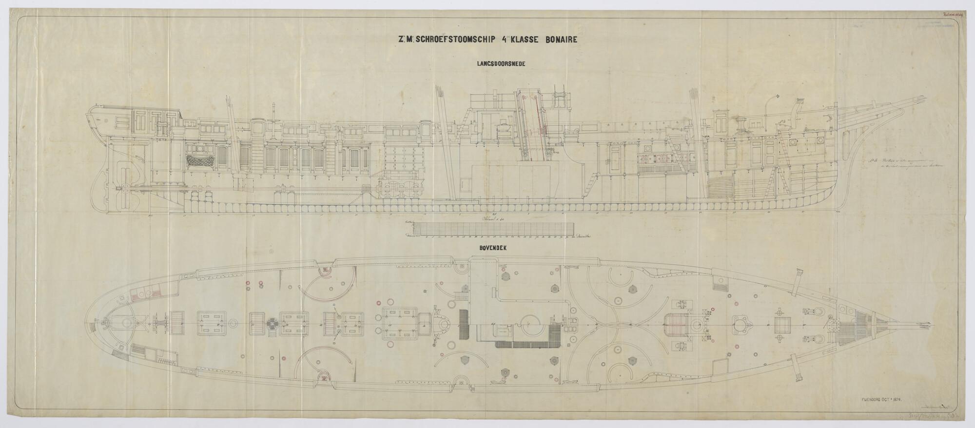 Langsdoorsnede tot op de kiel en bovenaanzicht van het bovendek van het schroefstoomschip der vierde klasse Zr.Ms. Bonaire