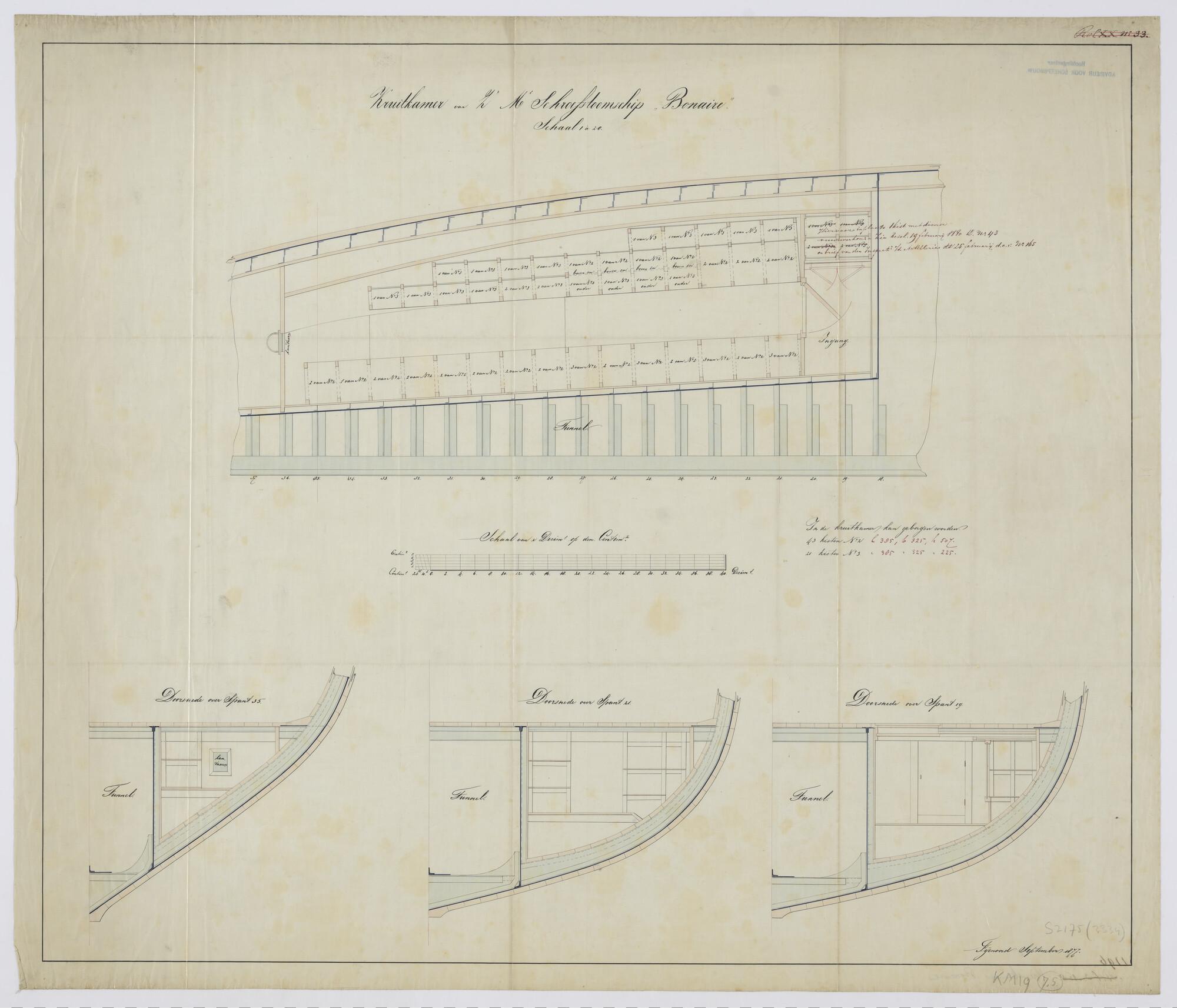 Indelingstekening van de kruitkamer in het ruim-achteruit van het schroefstoomschip der vierde klasse Zr.Ms. "Bonaire". Dwarsdoorsneden over de spanten 19, 21 en 35. Opgave van aantallen en soorten opgeslagen kruit. Schroefastunnel (schaal 1:20).