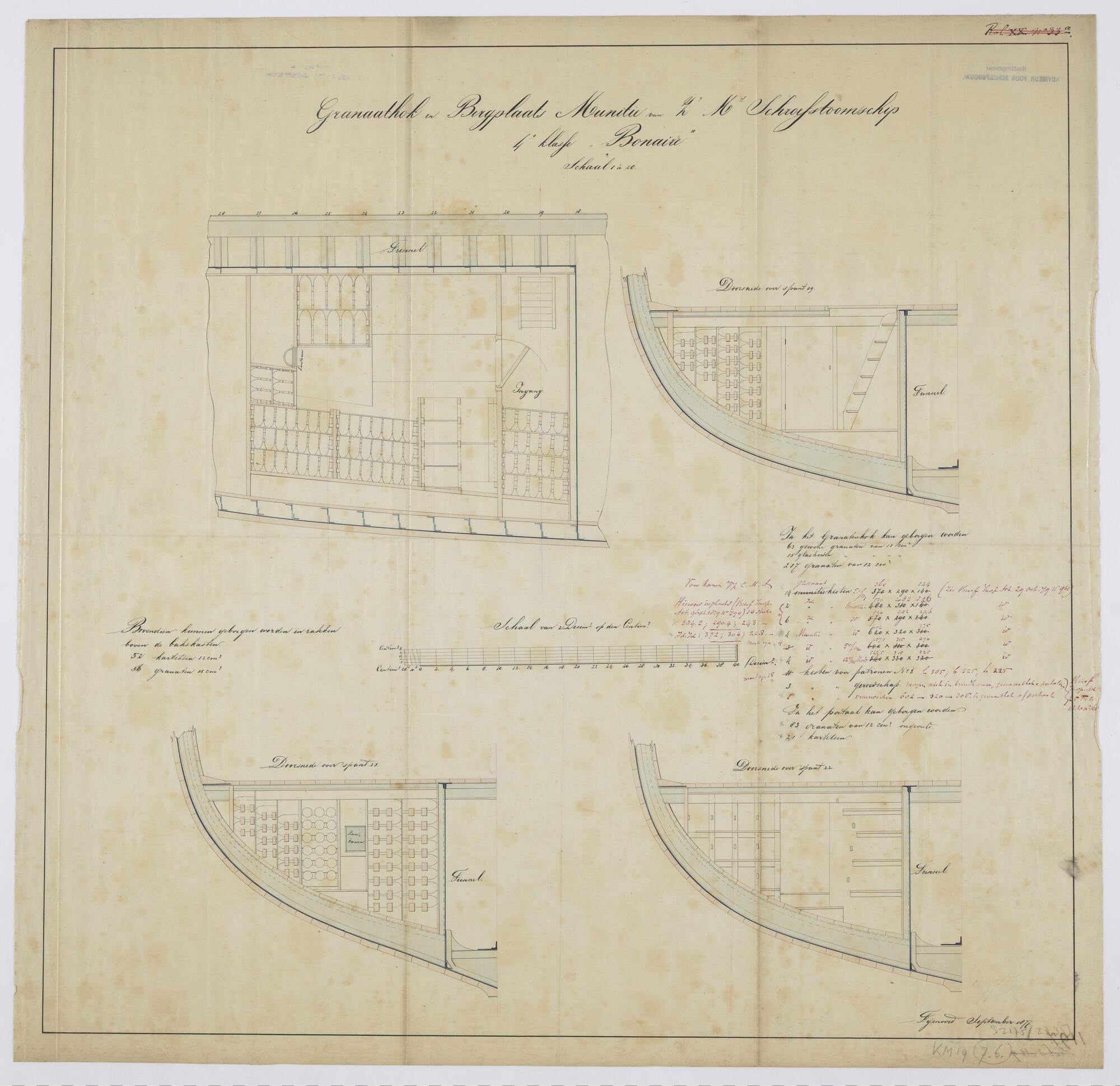 Indelingstekening van het granaathok en munitiebergplaats van het schroefstoomschip Zr.Ms. Bonaire