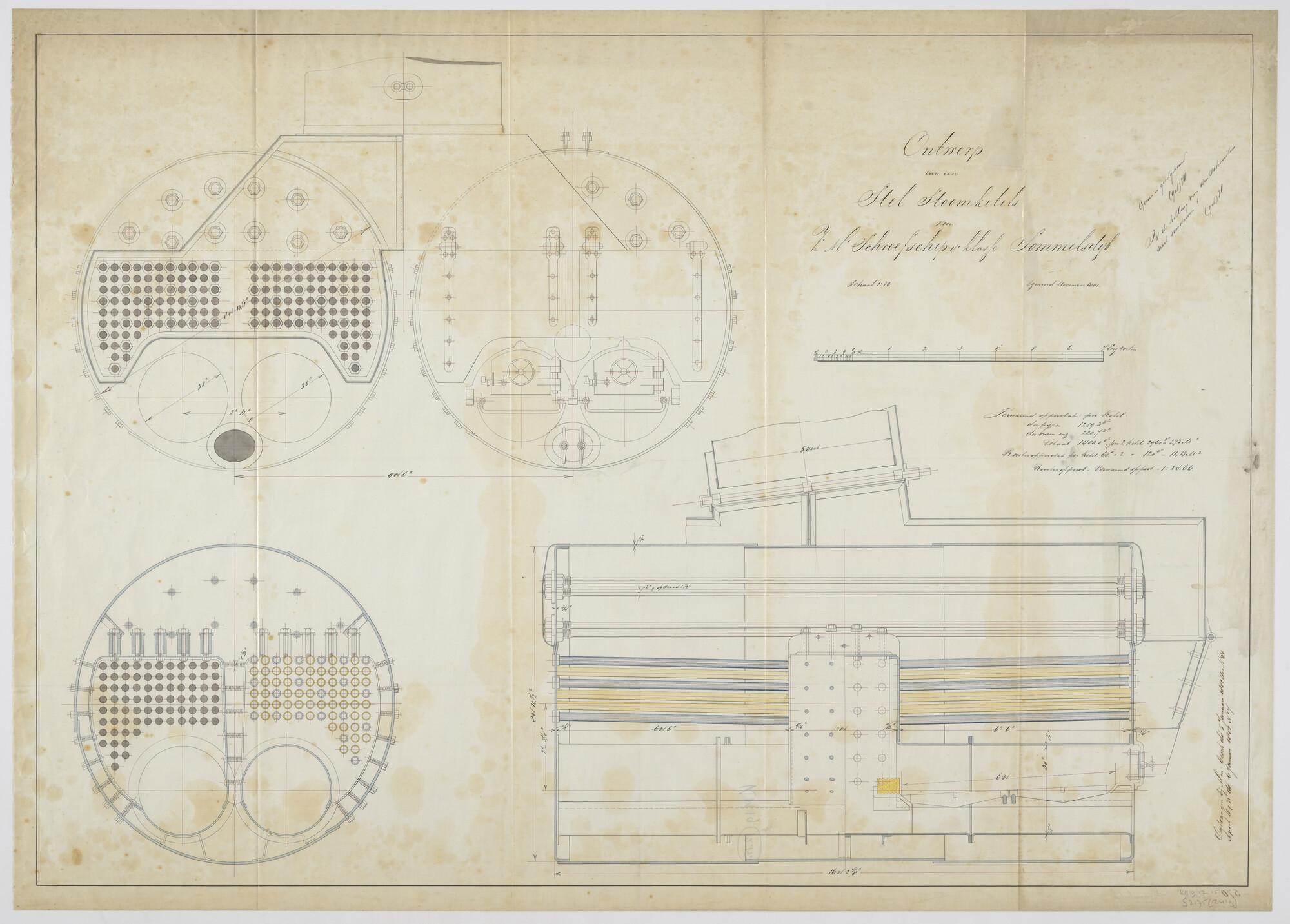 Diverse doorsneden van het stel Schotse hoofdstoomketels met twee vuurgangen en aan beide einden gestookt in het ketelruim van het schroefstoomschip der vierde klasse Zr.Ms. Sommelsdijk (schaal 1:10).