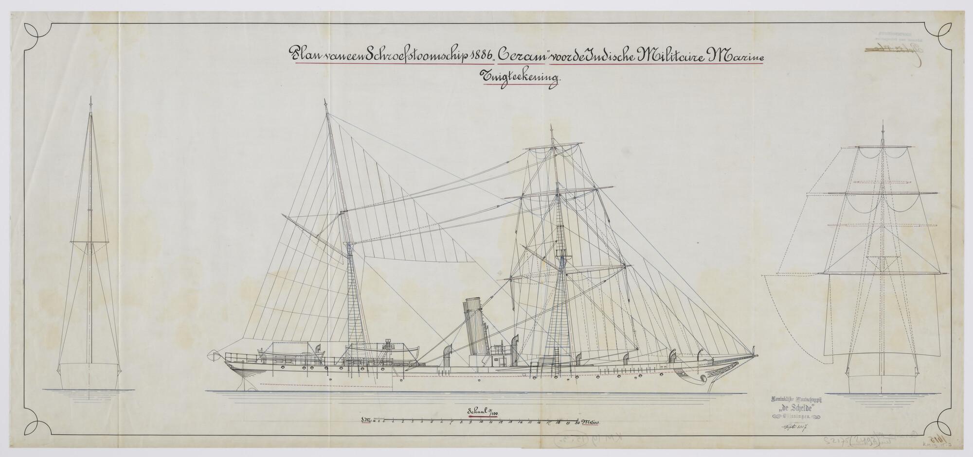 Zijaanzicht over stuurboord tot op de waterlijn met tuigage en rondhouten van het schroefstoomschip der vierde klasse Zr.Ms. "Ceram". Dwarsdoorsneden van de beide getuigde masten. Schoorsteen, sloepen, ventilatiekokers (schaal 1:100).