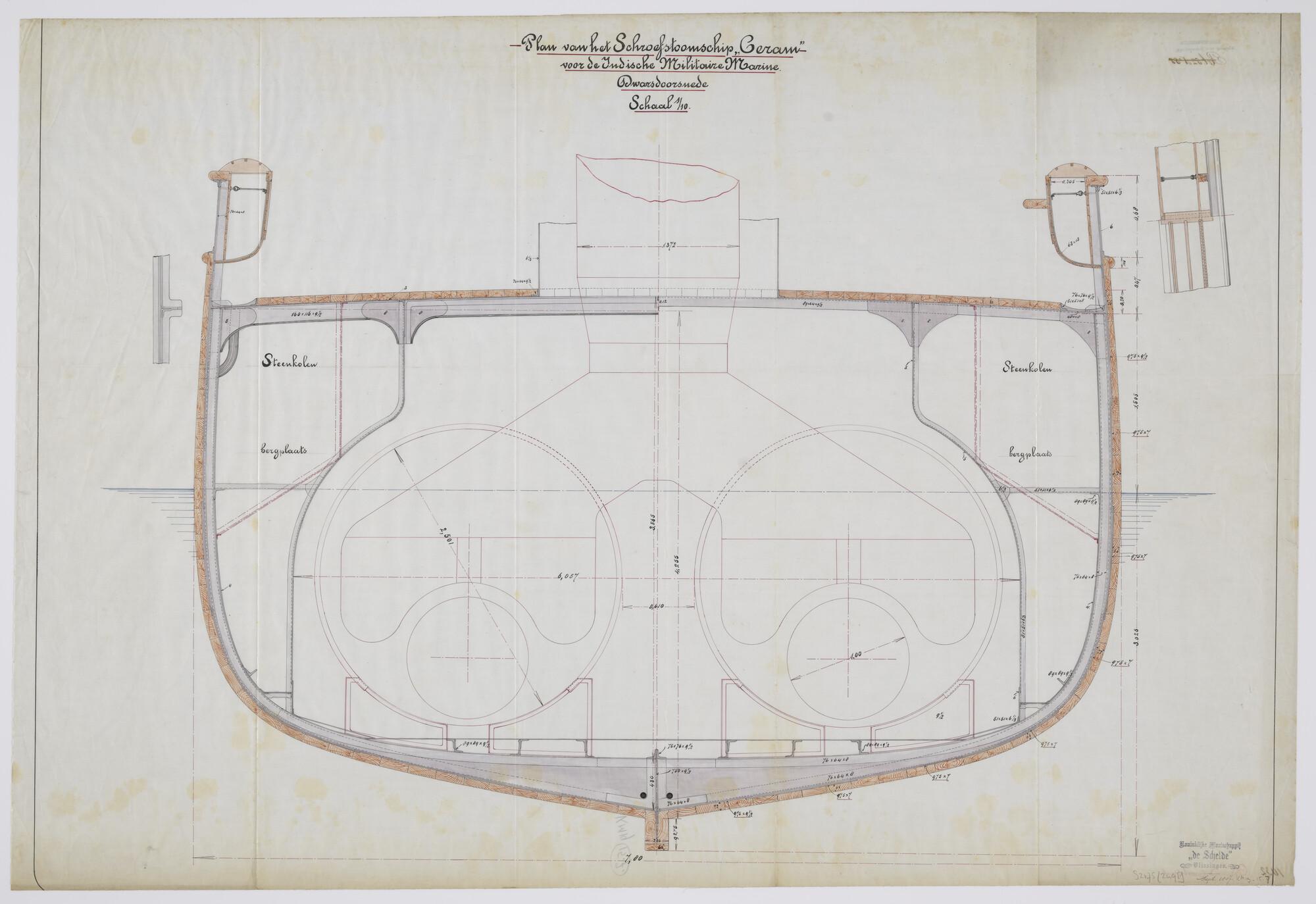 Dwarsdoorsnede over het grootspant van het schroefstoomschip der vierde klasse Zr.Ms. "Ceram". Houten buitenhuid met ijzeren huid van binnen. Kooienverschansing. IJzeren bovendek met hout belegd. Twee stoomketels en de schoorsteen. Kolenhokken (schaal 1:10).