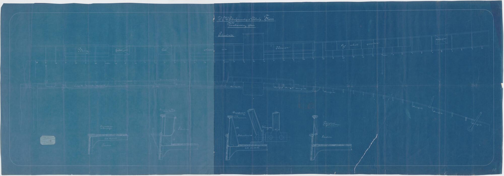 Langsscheepse doorsnede en bovenaanzicht van de verschansing van het schroefstoomschip der vierde klasse Zr.Ms. "Flores". Doorsnede over de kampanje, doorsnede over de bergplaats kooien, doorsnede over de verschansing, doorsnede over de geschutpoorten (schaal 1:20).