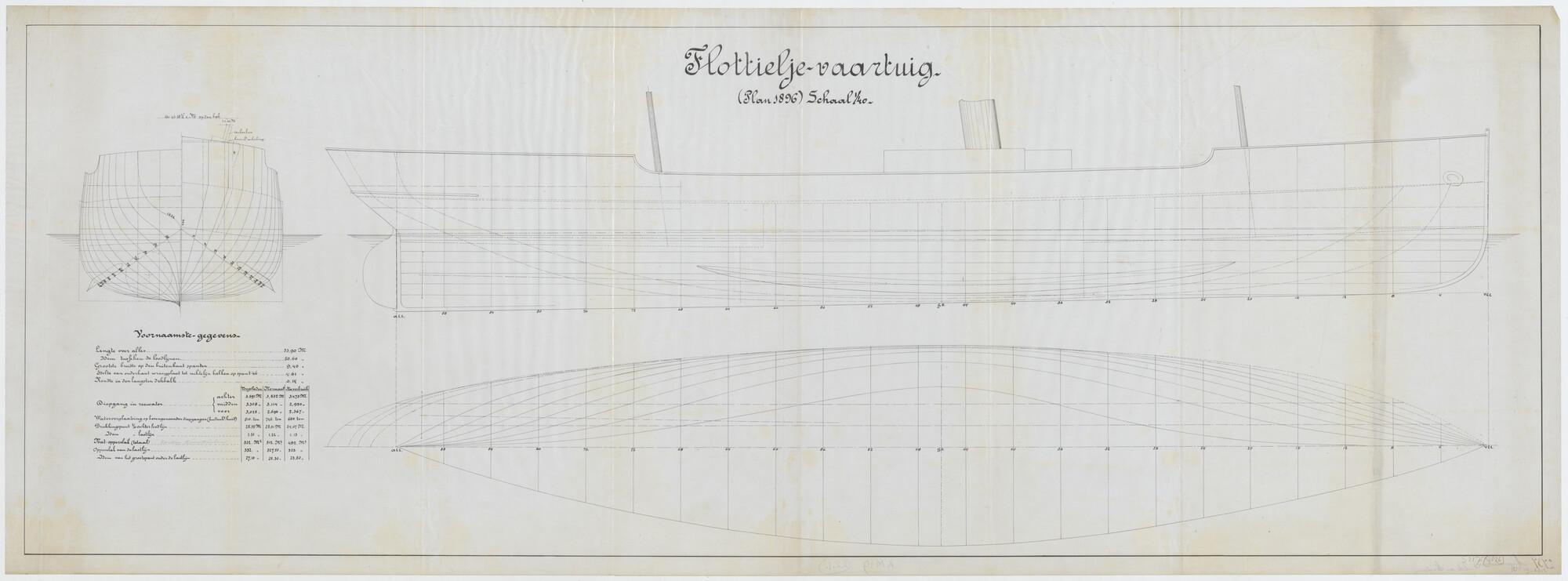Lijnentekening, spantenraam en overzicht van de voornaamste gegevens van de flottieljevaartuigen Hr.Ms. Edi en Hr.Ms. Serdang (Plan 1896) (schaal 1:40).