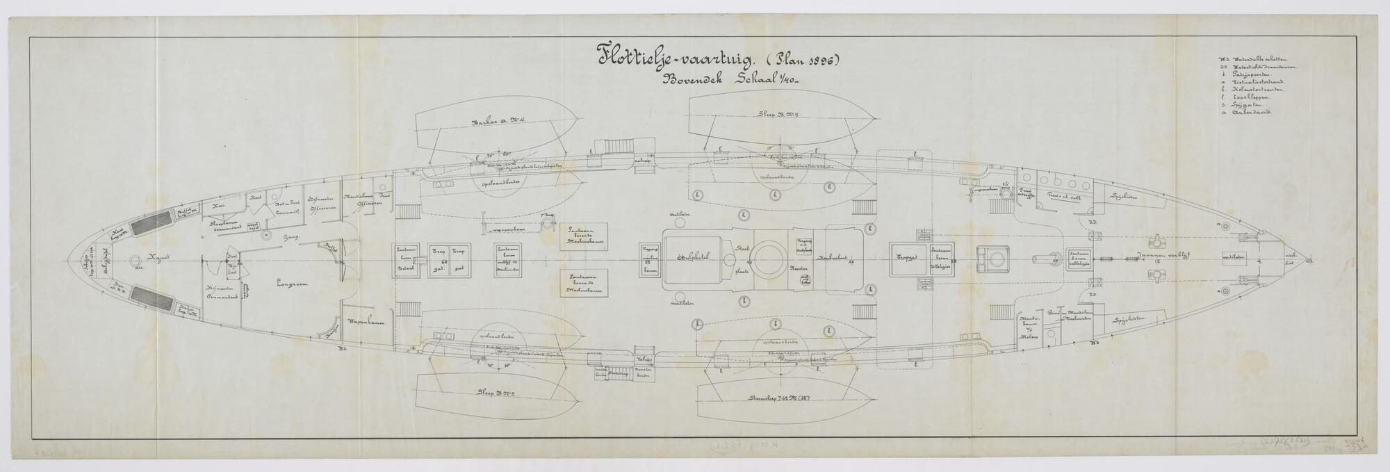 Indelingstekening van het bovendek van de flottieljevaartuigen Hr.Ms. "Edi" en Hr.Ms. "Serdang" (Plan 1896). Onder de bak: het Javanenverblijf, spijskisten, privé's, mandiekamer. Onder de kampanje: wapenkamer, officiersaccommodatie, longroom en kajuit (schaal 1:40).