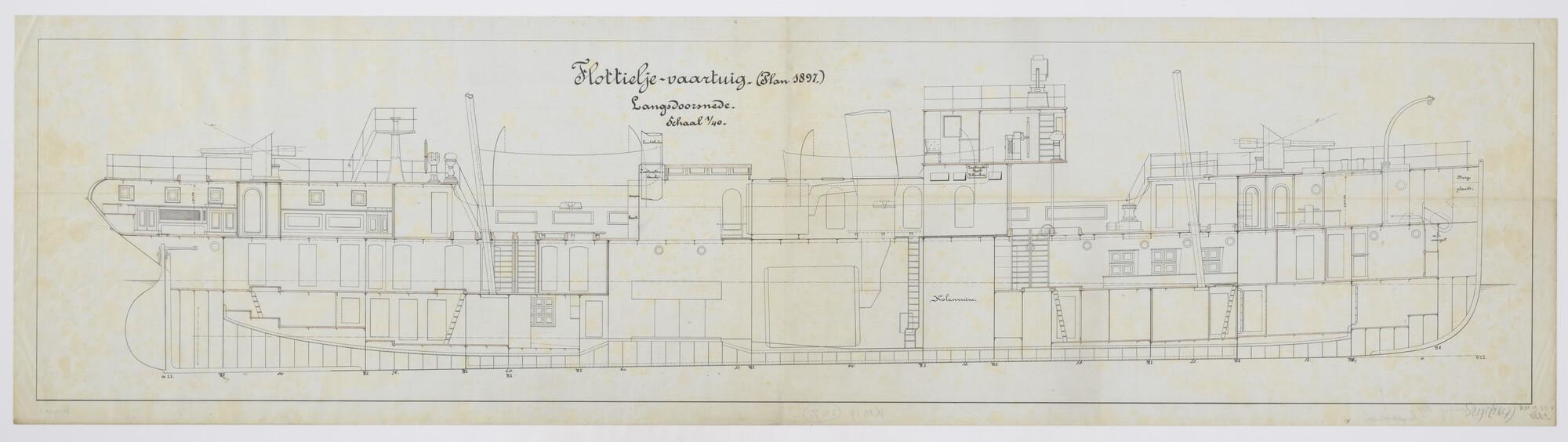 Langsdoorsnede tot op de kiel van de flottieljevaartuigen Hr.Ms. "Koetei" en Hr.Ms. "Siboga" (Plan 1897). Bewapening, accommodatie, bergplaatsen, ketelruim. bakdek, kampanje, brugdek, bovendek, tussendek voor en achter, ruim, enz (schaal 1:40).