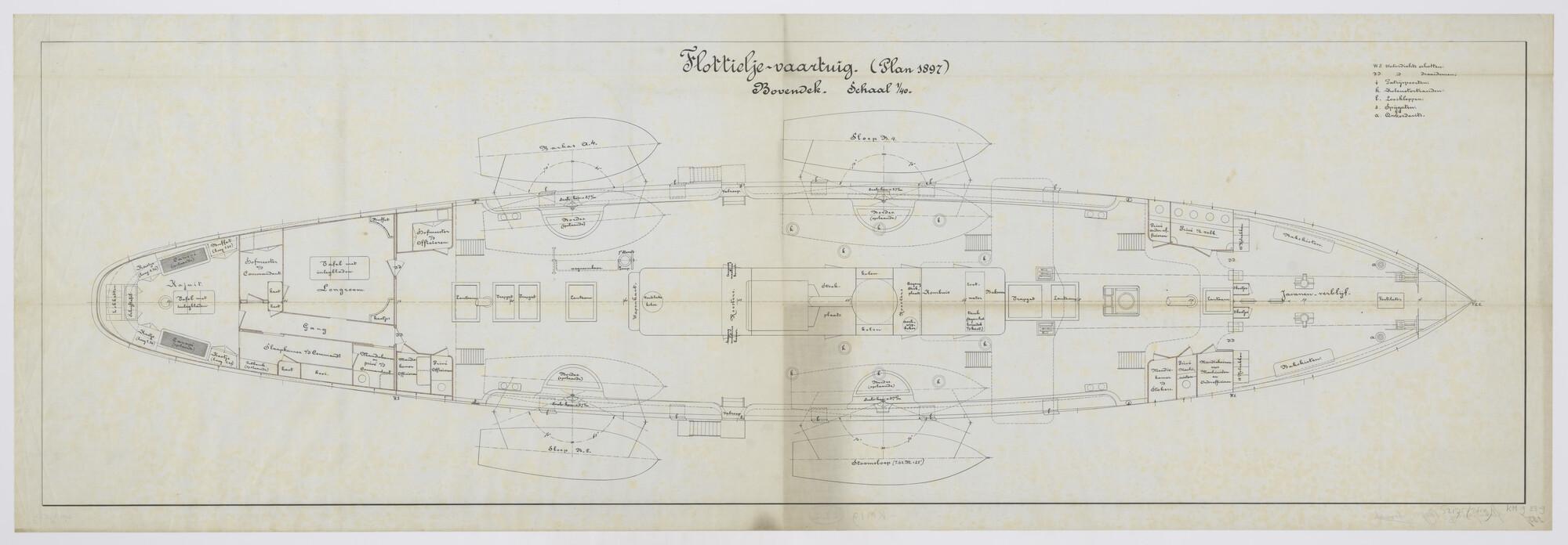 Indelingstekening van het bovendek van de flottieljevaartuigen Hr.Ms. 'Koetei' en Hr.Ms. 'Siboga' (Plan 1897)