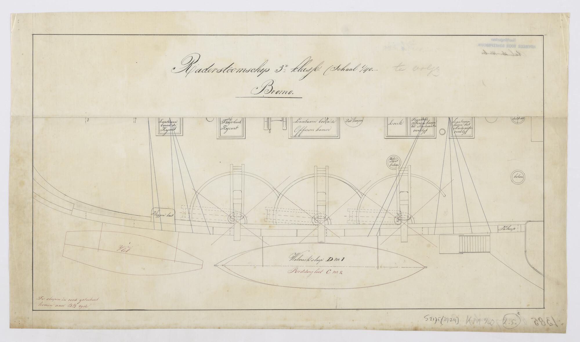 Indelingstekening van het bovendek in de midscheeps-aan stuurboord met plaatsing van drie kanons, drie geschutpoorten, lantaarn en toegang: kajuit, officierskamer (longroom), machinistenverblijf van het raderstoomschip der 2de klasse Zr.Ms. Bromo (II) (schaal 1:40).