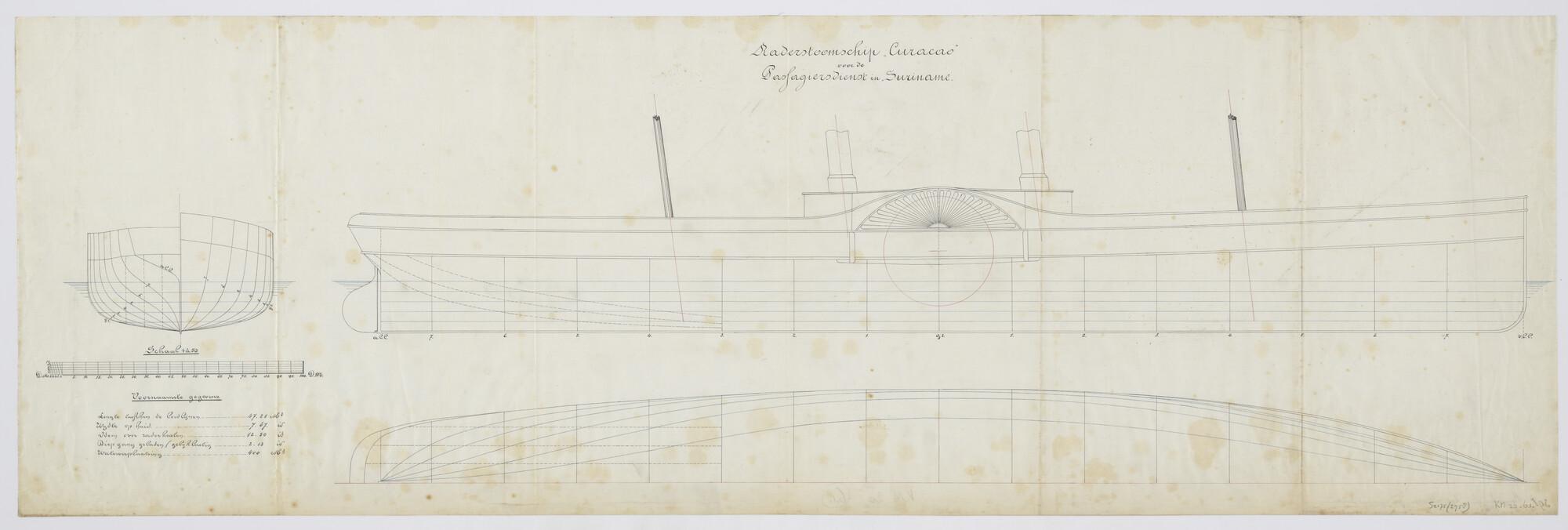 Lijnentekening, spantenraam van het raderstoomschip "Curaçao" voor de passagiersdienst in de kolonie Suriname. Met overzicht van de voornaamste gegevens van het plan tot het bouwen van het schip (schaal 1:50).