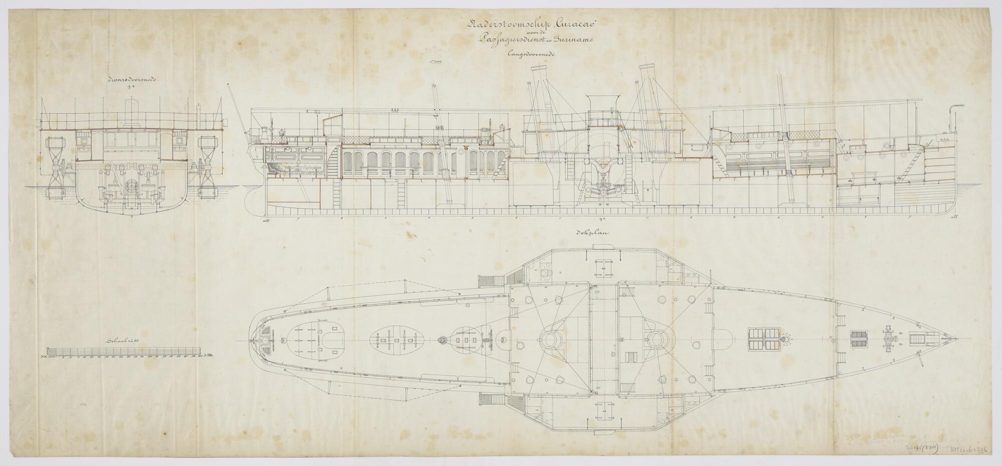 Inrichtingsplan van het raderstoomschip "Curaçao" voor de passagiersdienst in de kolonie Suriname. Langsdoorsnede met accommodatie voor passagiers en bemanning, dwarsdoorsnede over de raderkasten en dekplan (schaal 1:50).